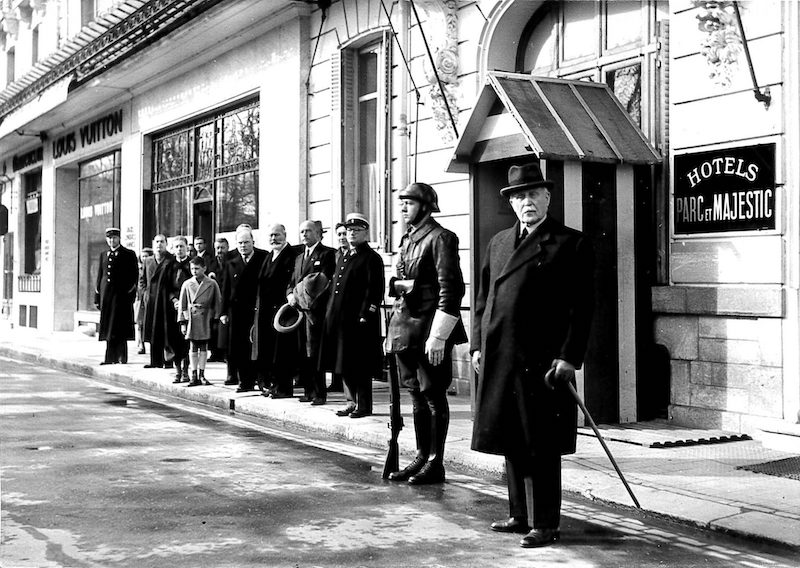 On aperçoit le magasin Louis Vuitton sur une photo de 1941 avec le maréchal Pétain devant l’hôtel du Parc.
