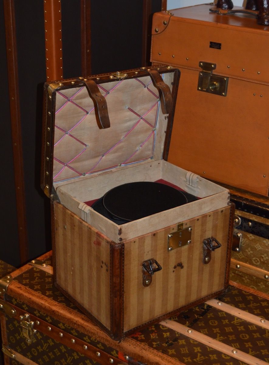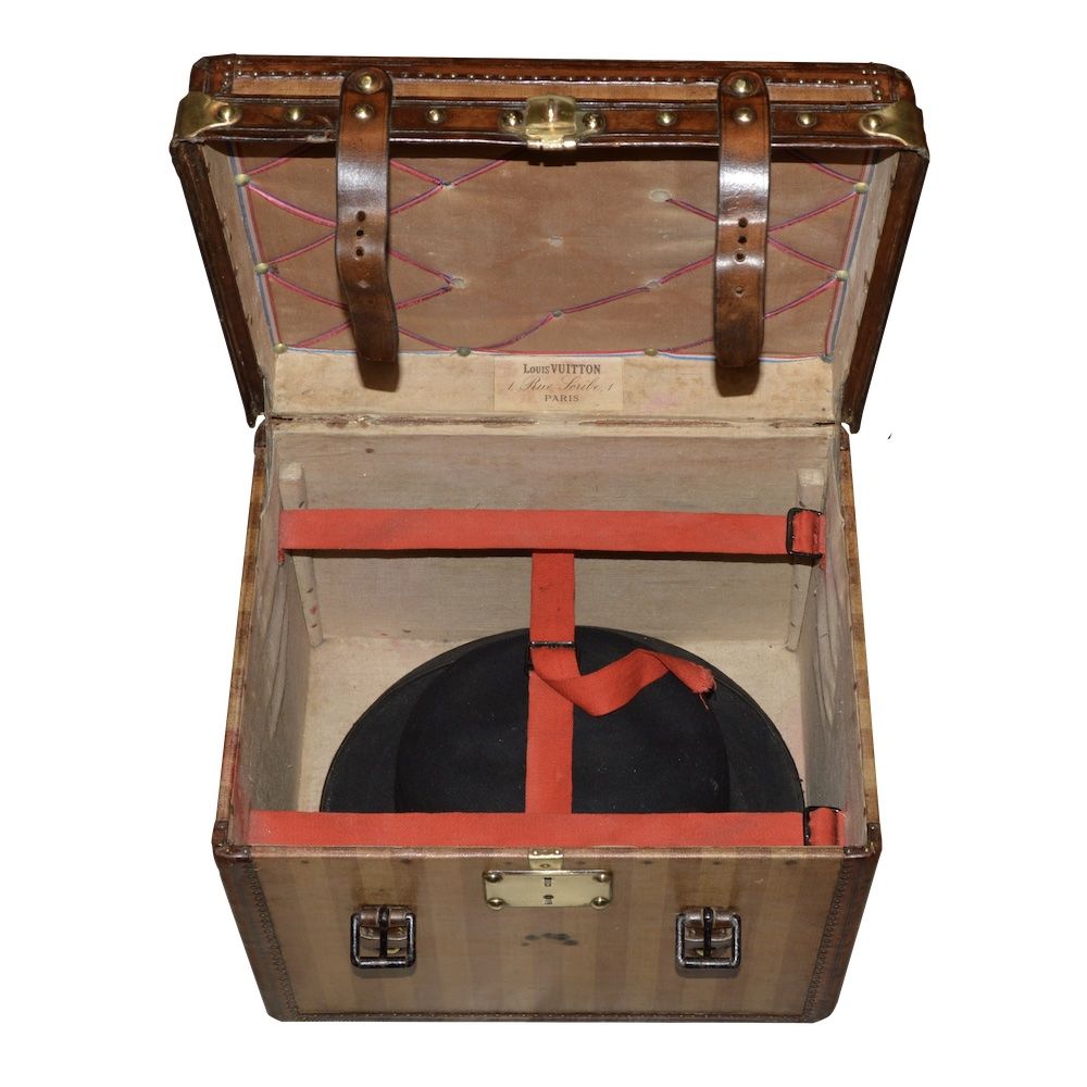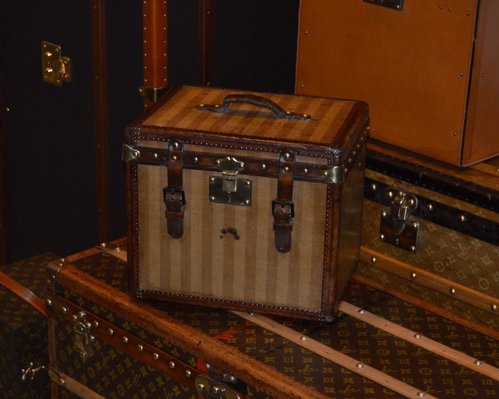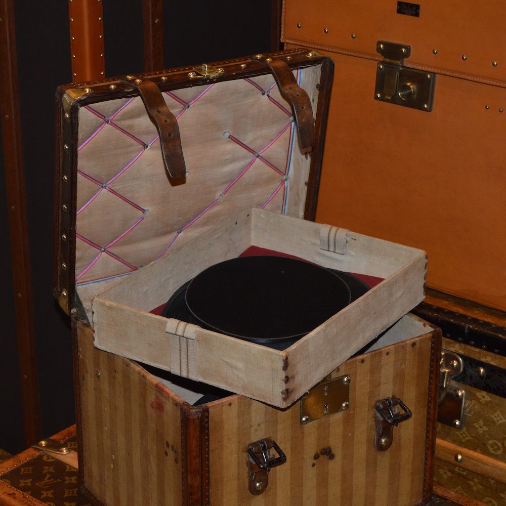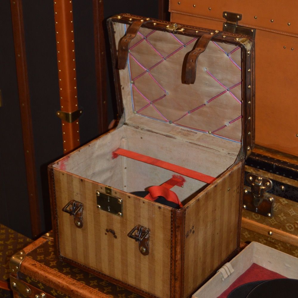 Adorable little Louis Vuitton hat trunk from 1883, covered with L.Vuitton's first striped canvas and protected by leather edges. Note the brass jewelry, with a leather handle on top and barbed buckles on the front. These buckles have been restored to their original condition. We also notice a restoration of the hinge on the back of the trunk + the change of the lock hasp. The striped canvas was offered by Louis Vuitton from 1872 to 1888 only, it is the first trunks of the brand with a patterned canvas. The checkerboard is presented just after, followed by the monogram canvas in 1896.