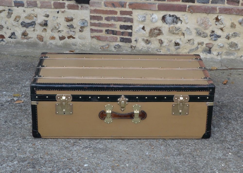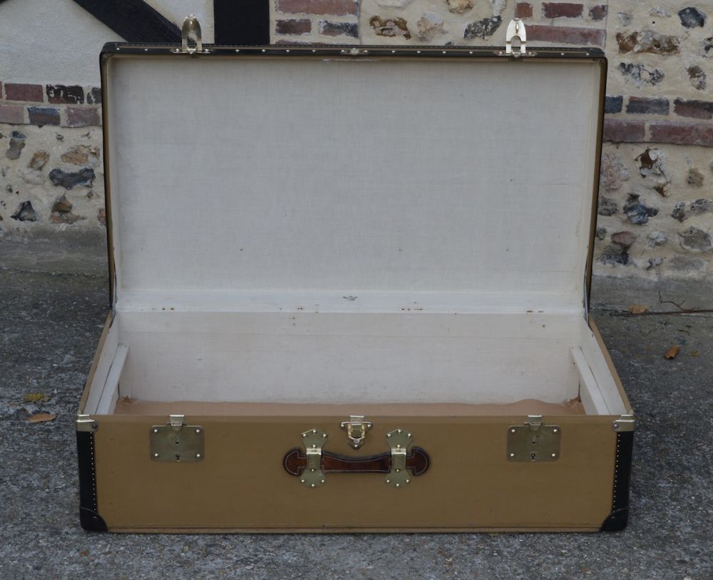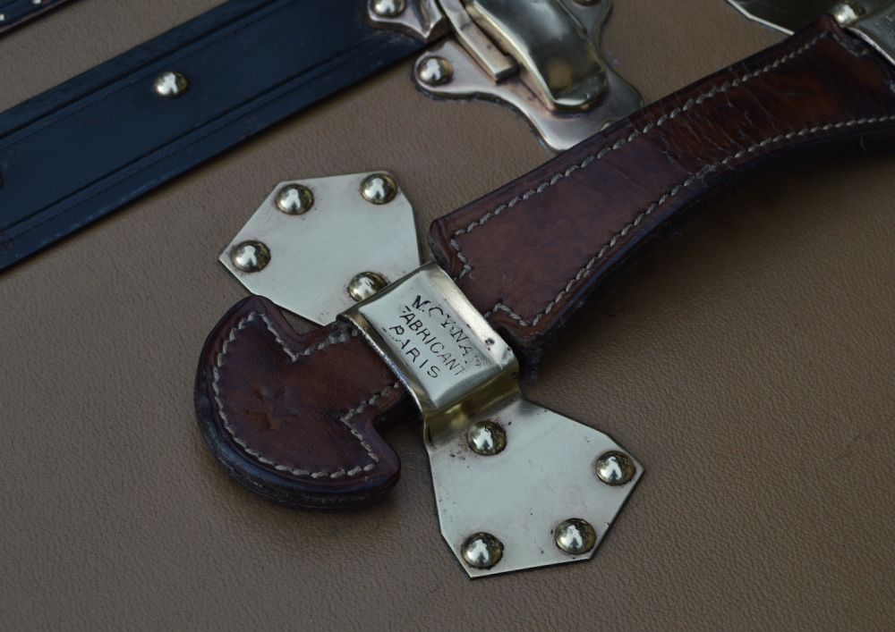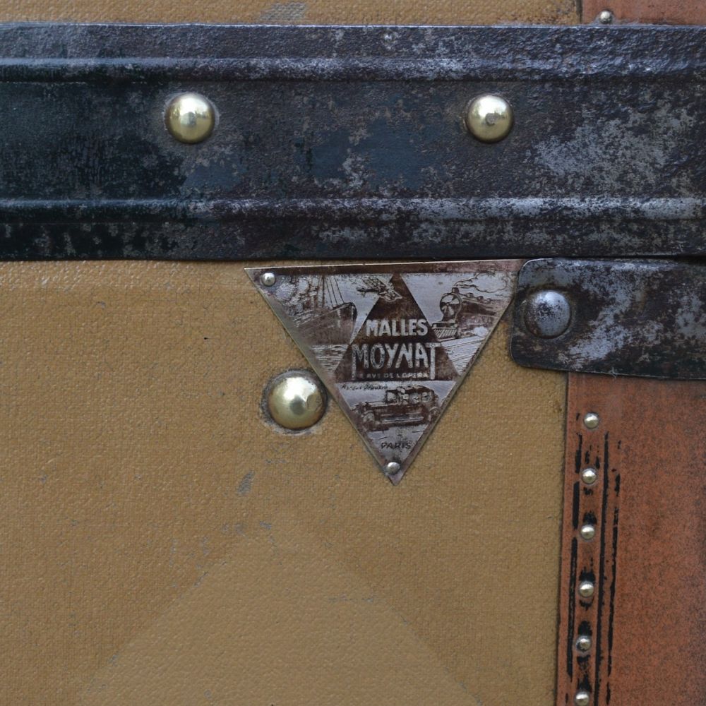 This luggage is equipped with three leather handles, maintained thanks to brass enchapes stamped MOYNAT. The Moynat authenticity plate is attached to one side of the trunk and the manufacturer's label is glued to the inside. The bottom of the trunk is in perfect condition.
