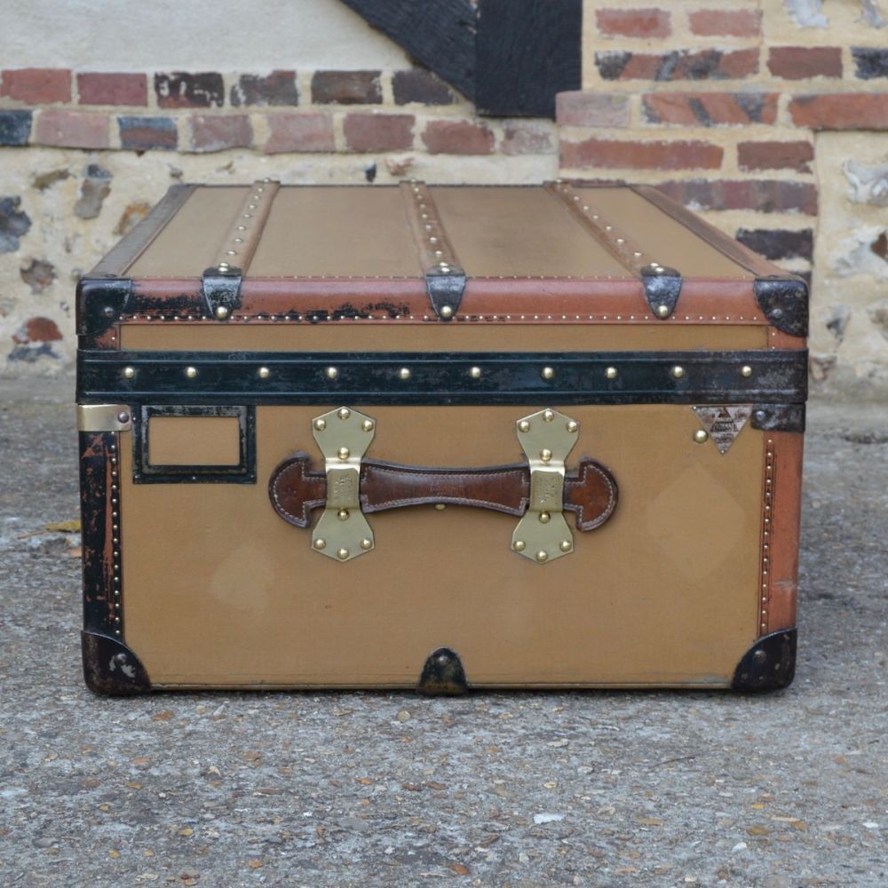 Very nice 1920's Moynat cabin trunk, covered with a beige coated canvas. The trunk is protected by lozine borders, originally painted in green. We notice a very nice patina of the borders on some places of the trunk, with a variation of colors between the original color and the painted borders.