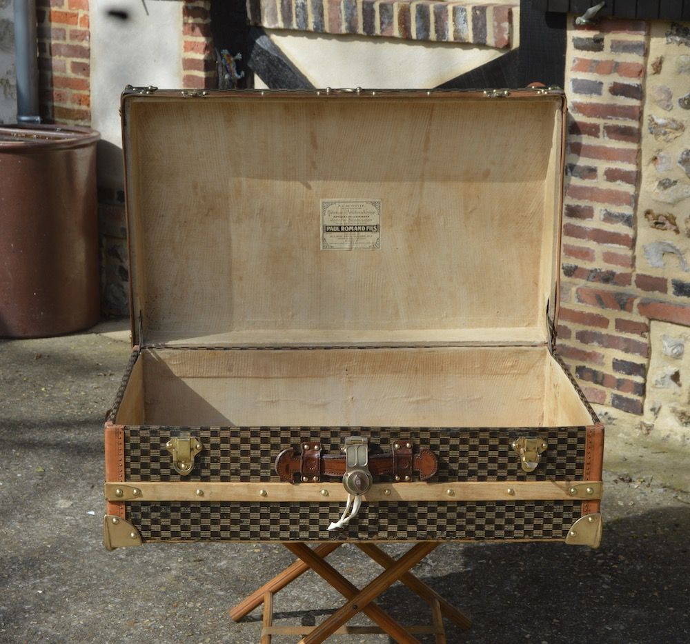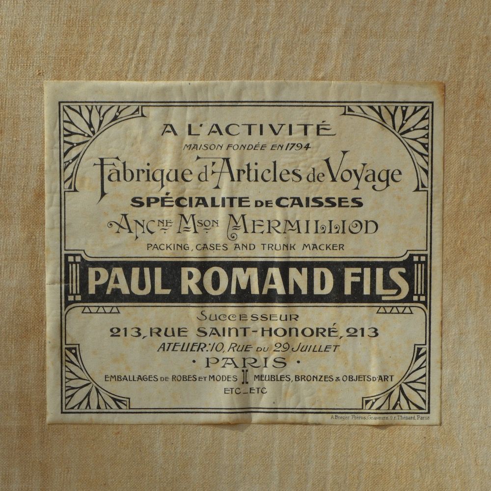 The inside of the trunk is lined with an unbleached linen cloth, with the label of the manufacturer Paul Romand indicating the address of the store at the time at 213 rue Saint Honoré.