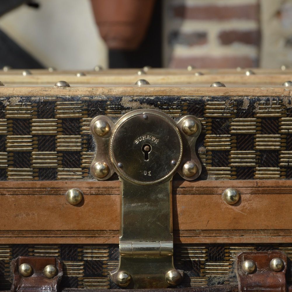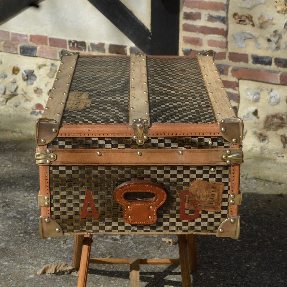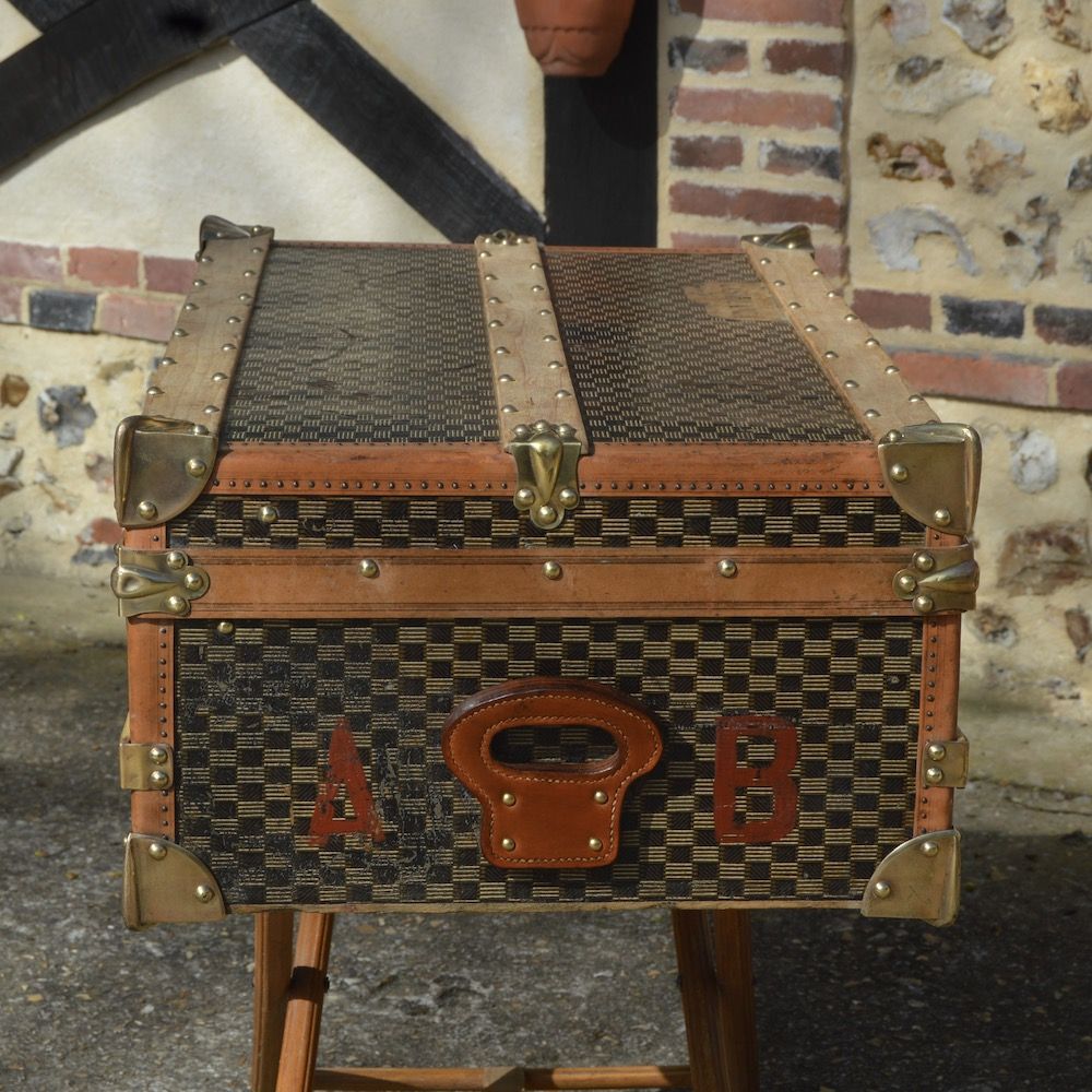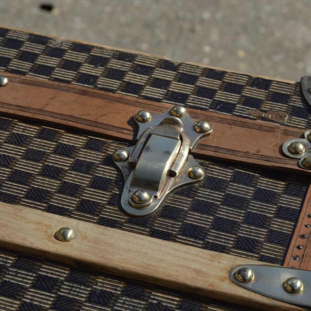 Charming cabin trunk covered with a coated checkerboard canvas and protected by lozine borders. The trunk has brass jewelry on all sides, with "elephant ear" handles on each side, and an "American" type lock on the front. The trunk is also equipped with reinforced corners and angles for all types of travel. This canvas with checkerboard pattern is similar to the canvas used by the Moreau house located on rue Saint Honoré. The trunk is sold with its original key.