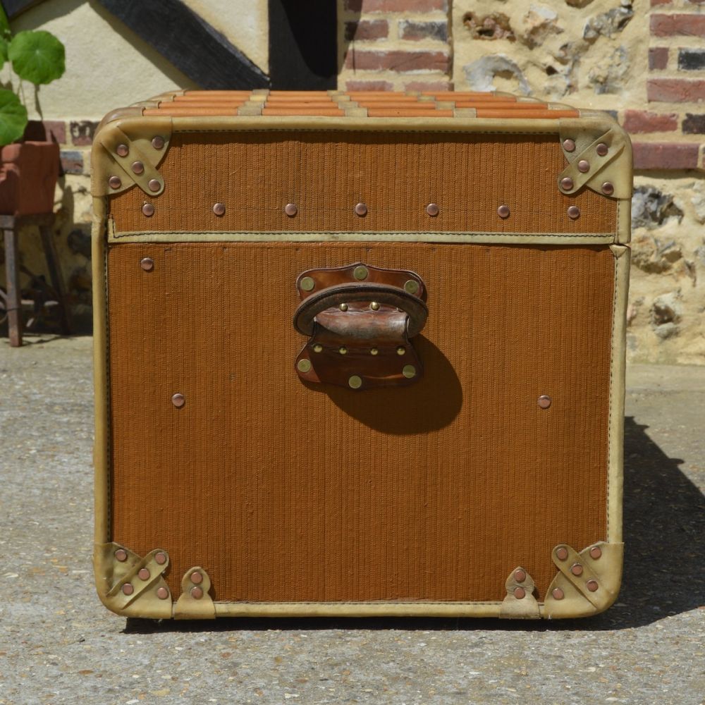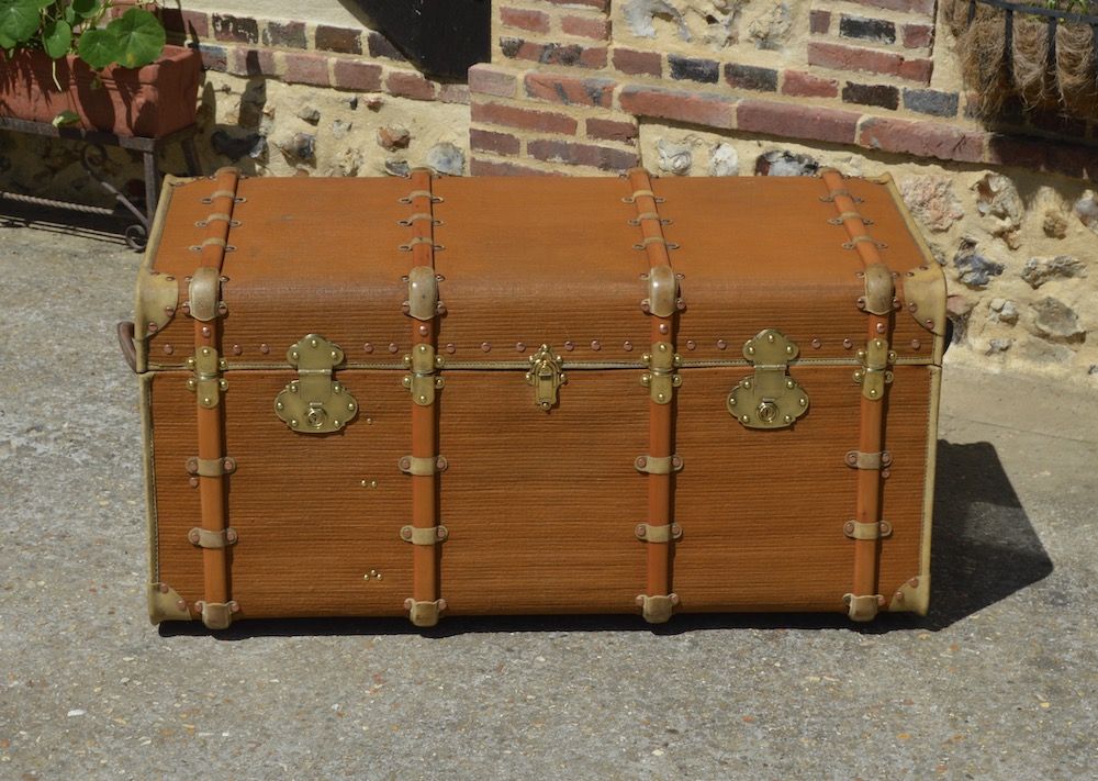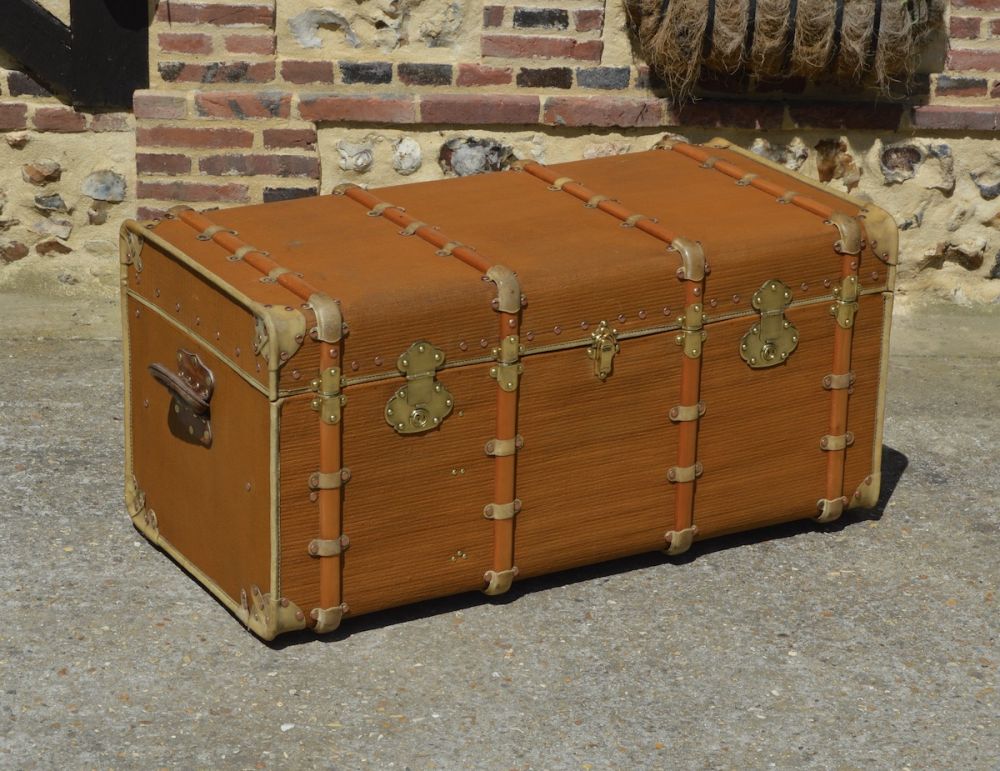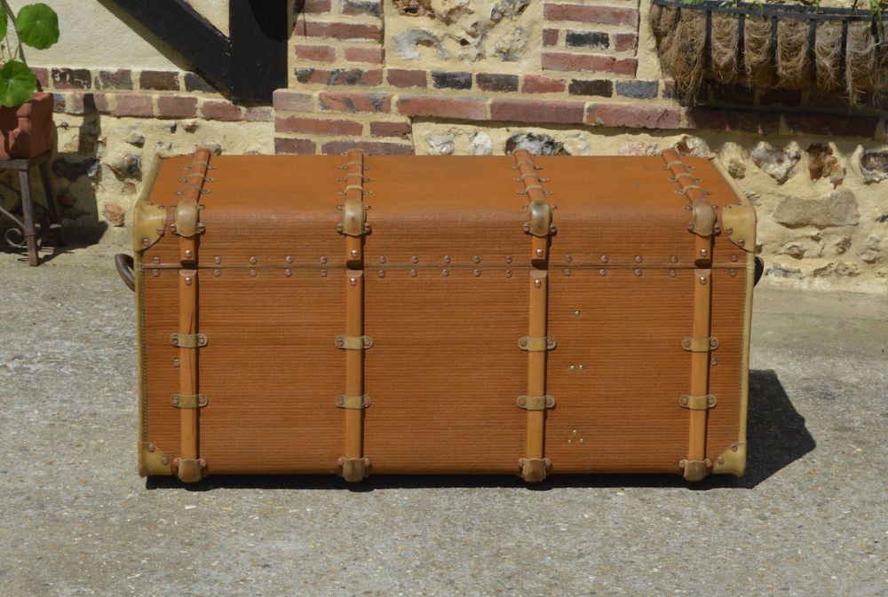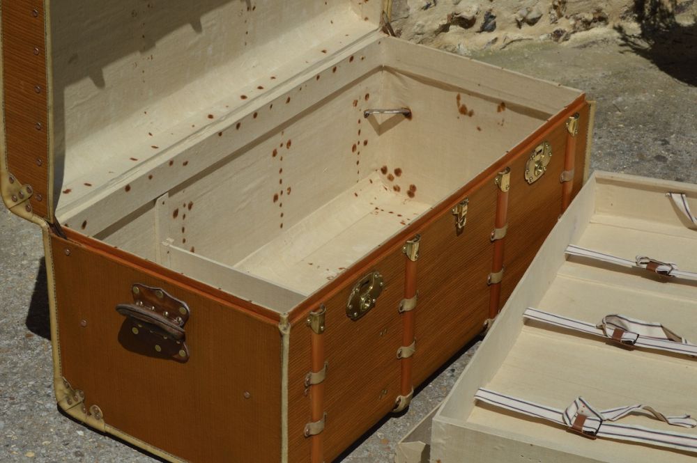 On retrouve les emblématiques "poignées éléphant" sur chacun des côtés, avec des renforts sur l'ensemble de la malle. Les bords sont cousus et des clous en cuivre sont utilisés pour empêcher l'oxydation.