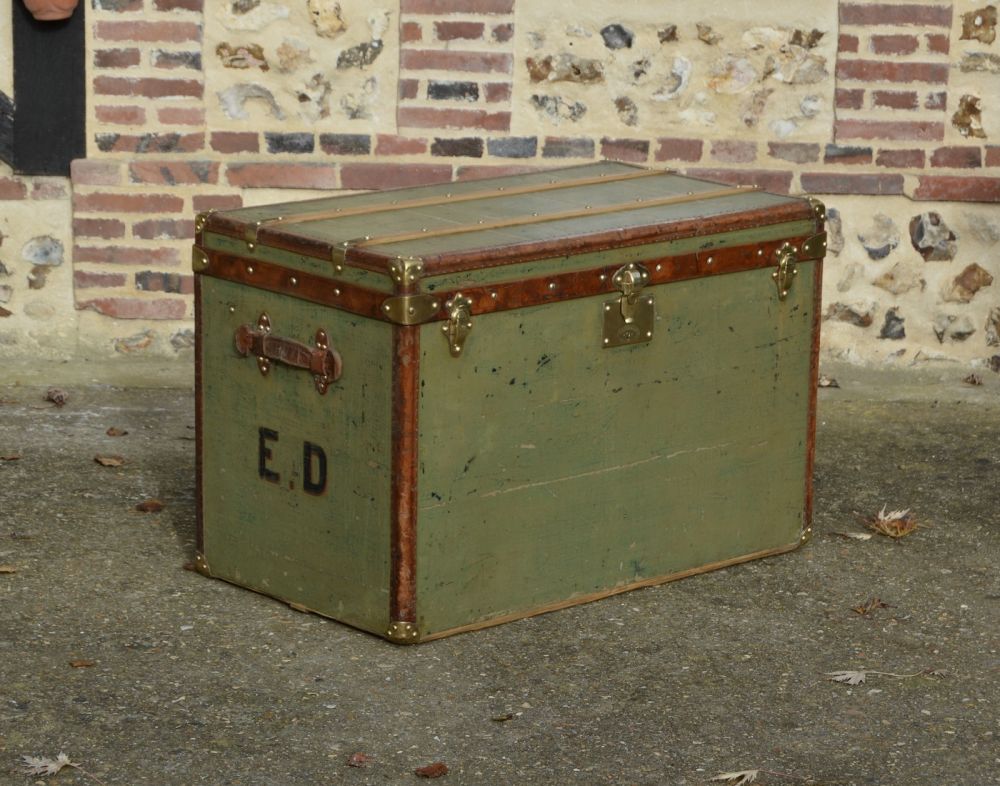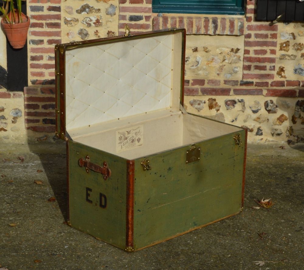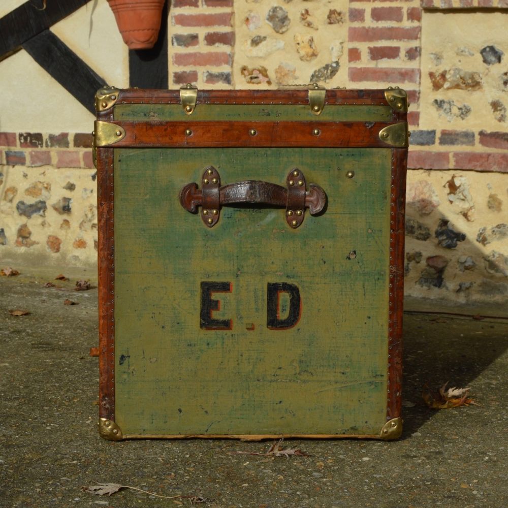 Beautiful Goyard trunk covered with a green coated canvas, from the 1900s. Protected by leather borders, this beautiful trunk was originally used to carry hats. There are leather handles and the original customer's initials E.D. on each side.