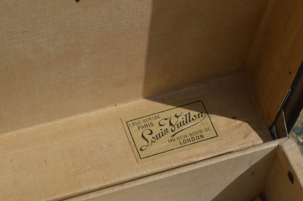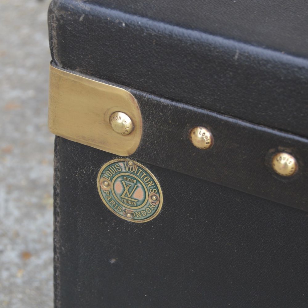 A "Louis Vuitton motor trunks" plaque is visible on each side, as well as two brass handles, originally designed to receive a strap for attachment to the roof of a car. The interior of the case is very clean, with the Louis Vuitton trunk maker's label and the serial number of the case.