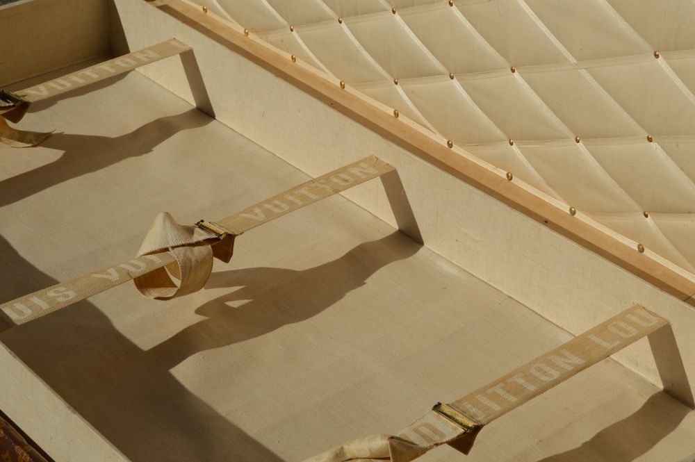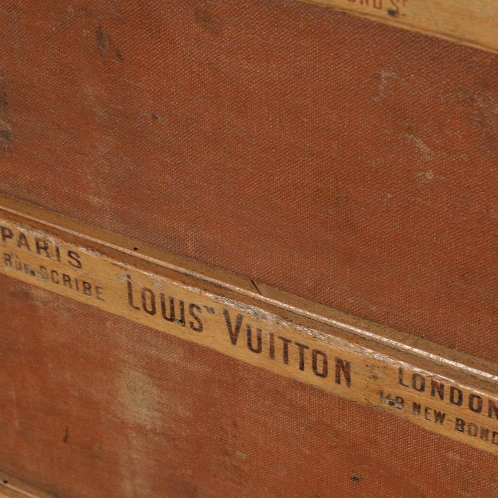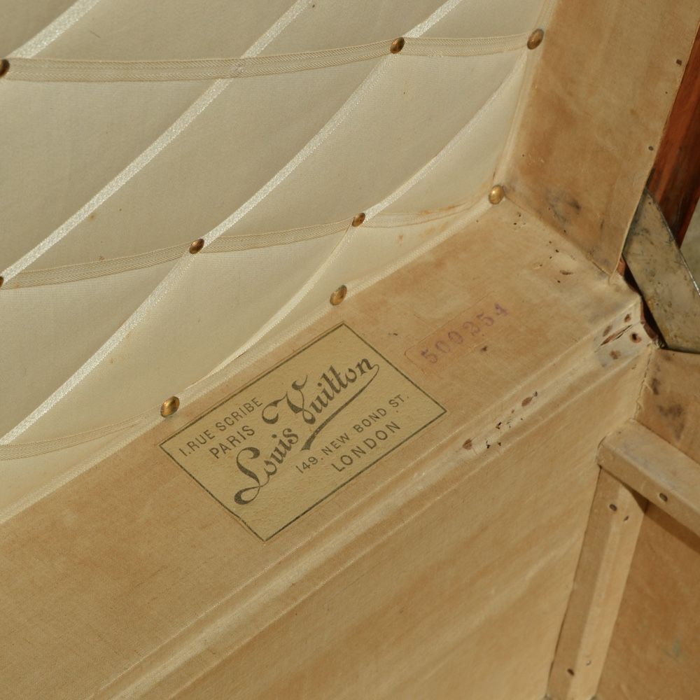 The interior of the trunk is lined with a beige linen canvas, with an original pad in the upper part and a removable frame for storing clothes in the trough. The canvas straps and brass buckles are monogrammed "Louis Vuitton". Also note the Louis Vuitton manufacturer's label, with the trunk's serial number inscribed on the linen.