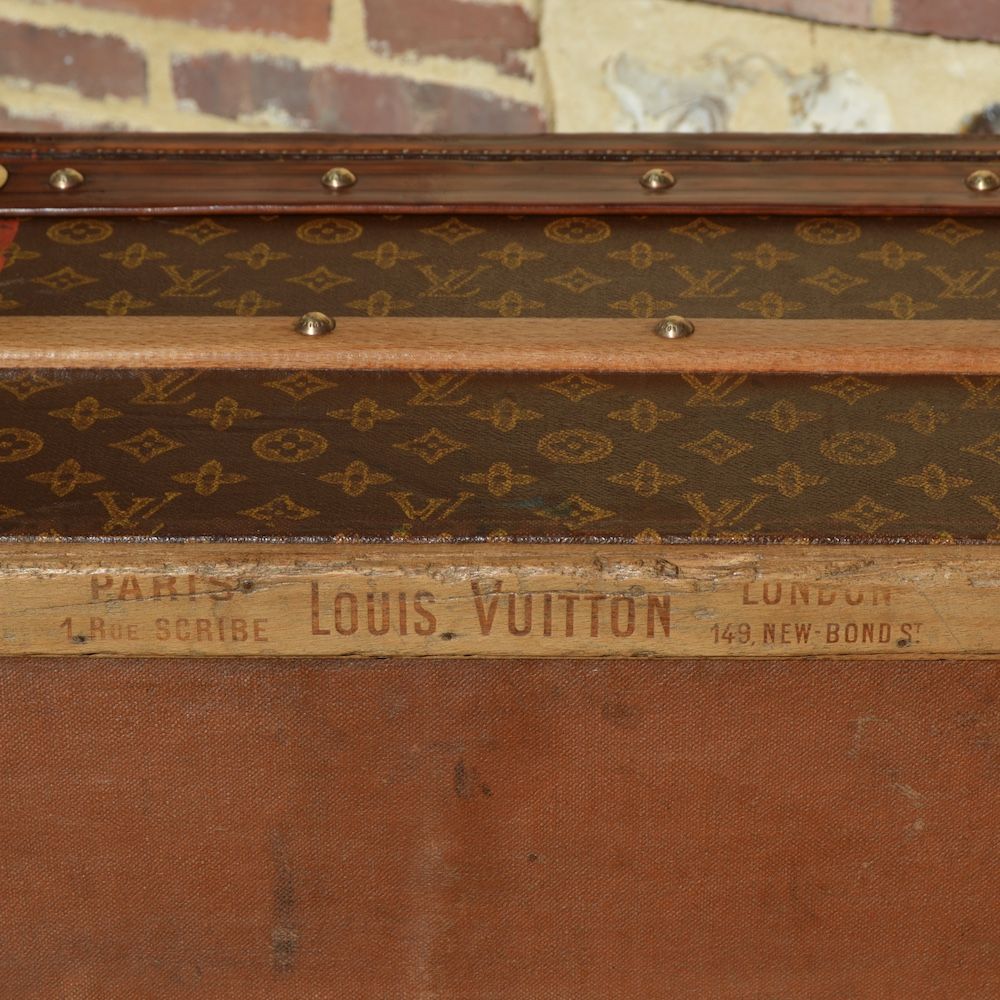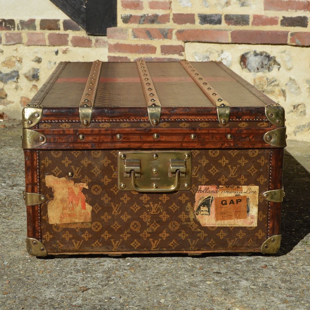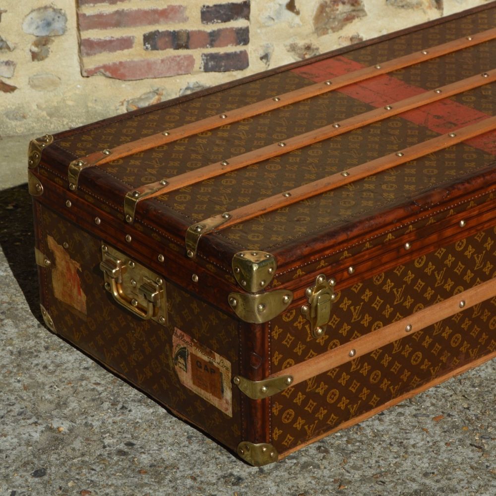 Very nice Louis Vuitton Cabin Trunk from the 1910s in perfect condition, protected by leather trim, the most luxurious and fragile finish offered by Louis Vuitton until the 1940s. There is also the iconic stenciled monogram cotton canvas, as well as brass jewelry and locks stamped "Louis Vuitton Paris". A red stripe is painted on the trunk, allowing at the beginning of the century to differentiate the different luggage of the original customer by his staff during a trip.