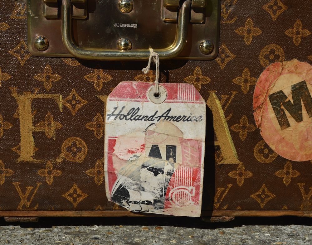 There are also many shipping labels on each side, indicating a round trip between the Netherlands and the United States of America with the famous shipping company "Holland-America Line".