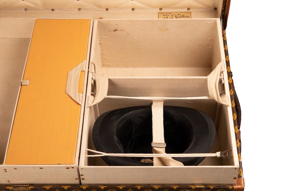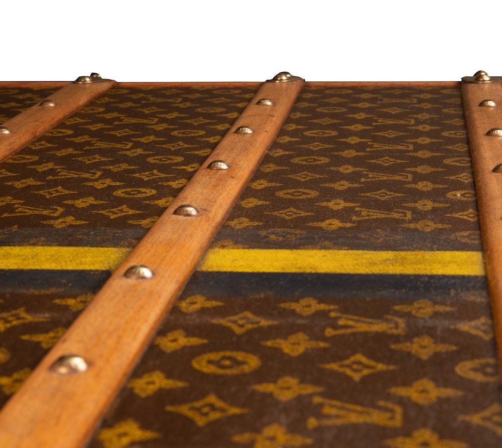 The bottom of the trunk is equipped with four wheels, with the Louis Vuitton marking on the wooden slats. Originally, these 33cm high trunks accompanied the traveler during the journey, stored under the berth in the cabin of the liner or sleeper.
