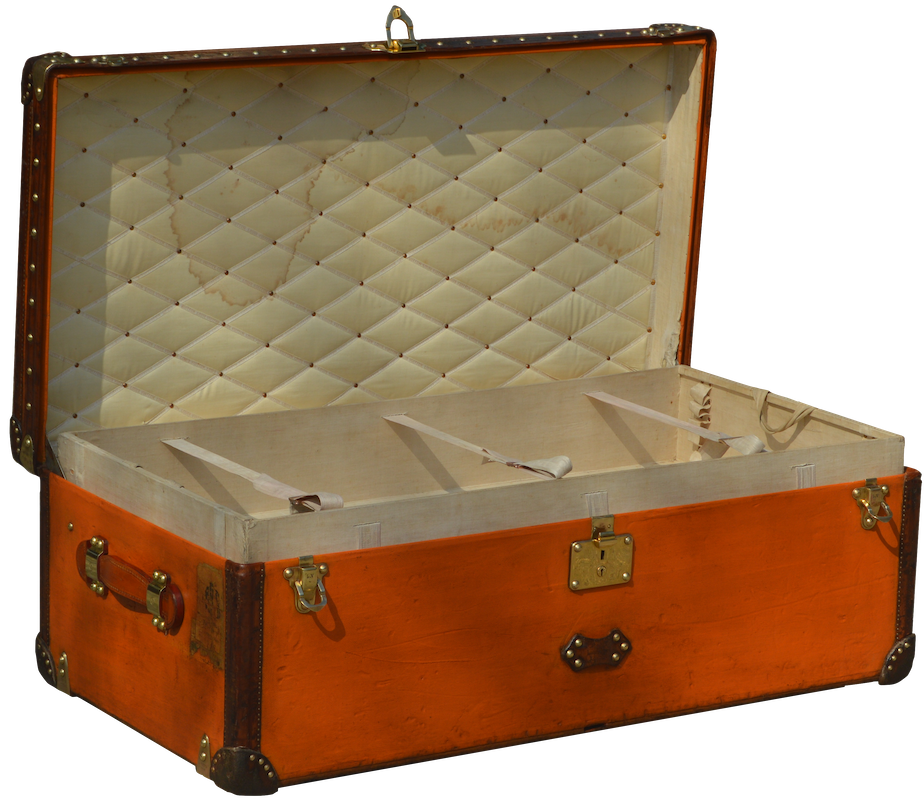 The interior of Louis Vuitton's cabin trunks was most often padded, to protect the contents of the trunk as best as possible. This padding also allowed pins or family photos to be attached directly to the inside of the luggage. These pins are often found during the restoration of the padding.