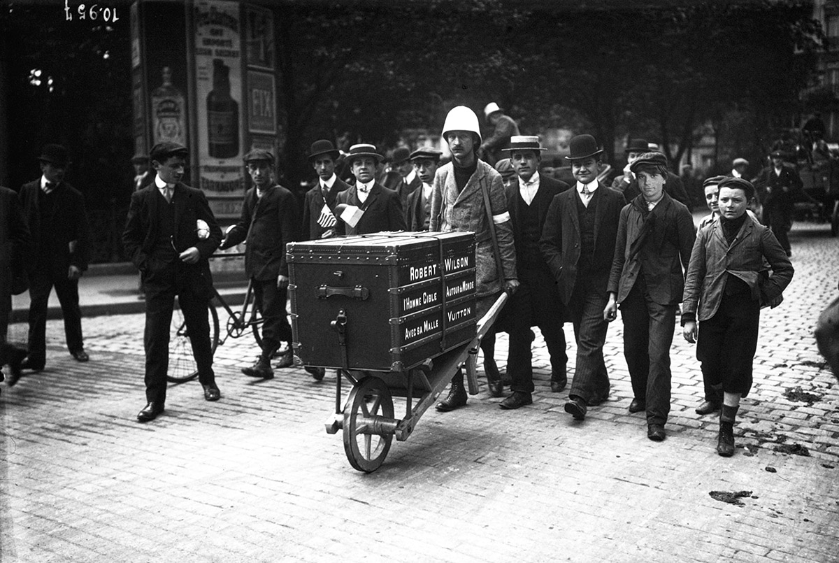 In 1910, Robert Wilson succeeded in financing his travels thanks to Louis Vuitton. First with the help of a wheelbarrow, then a cart, he carried his Louis Vuitton trunk around Europe with the inscription "L'homme Cible Autour du Monde Avec sa Malle Vuitton". With his colonial clothes and his luxury trunk, the man was quickly noticed in the largest cities of Europe. The event was shared through a series of 9 extraordinary postcards.
