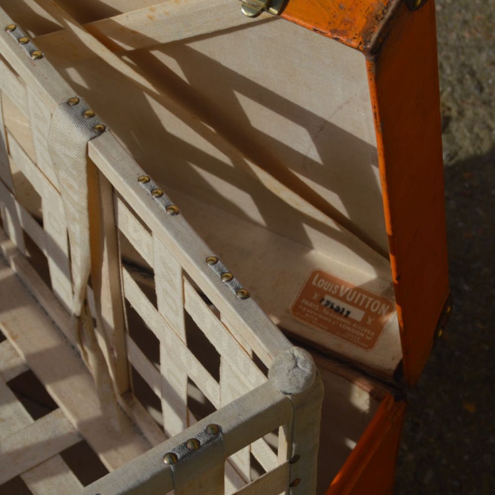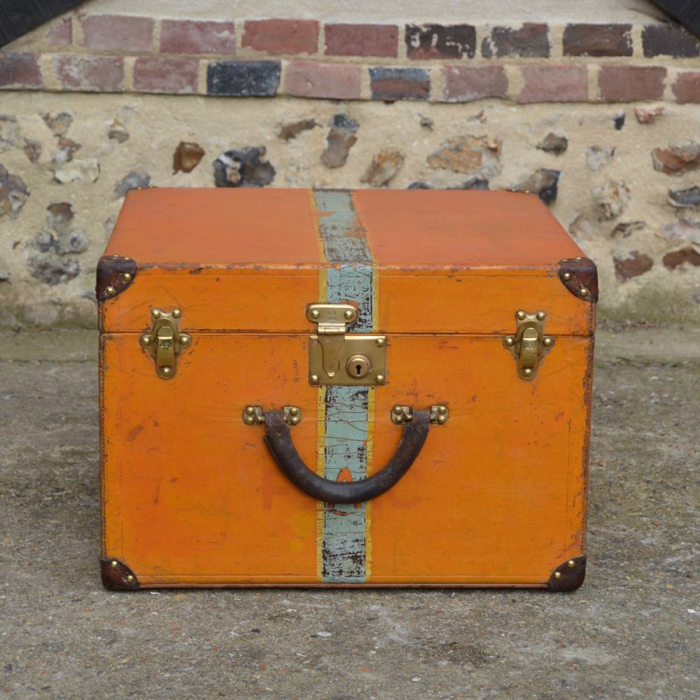 Rare Louis Vuitton hat trunk from 1908, covered with an orange vuittonite coated canvas, emblematic of the brand. The three brass clasps are signed Louis Vuitton, as well as the lathing under the trunk and the various brass studs.