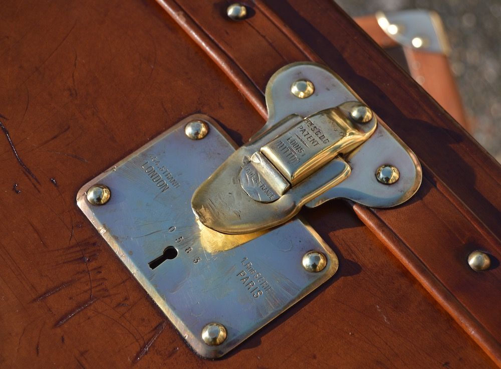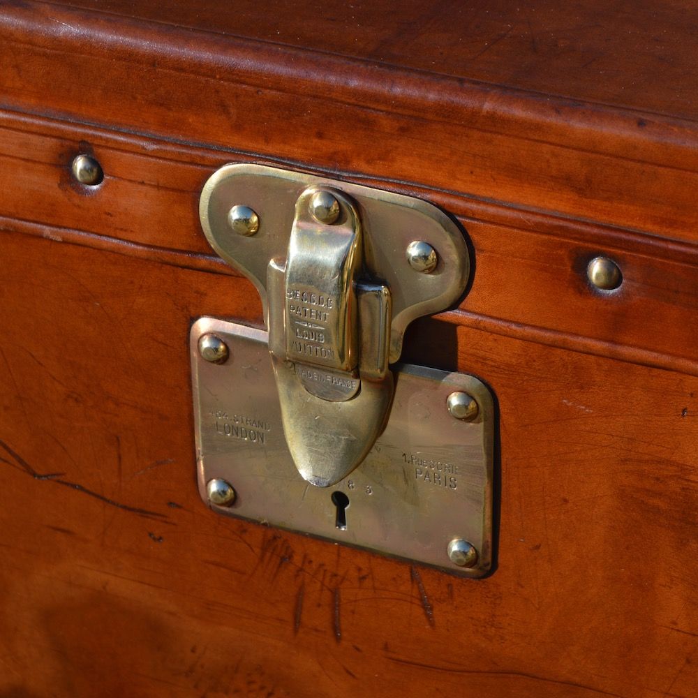 The original leather handle is visible on the top of the trunk, with a central brass lock stamped "Louis Vuitton" and indicating the various store addresses of the period. It can also be seen that the lock has been broken during its lifetime, with tool marks on the lower part of the clasp. The 4-digit lock number is clearly visible.