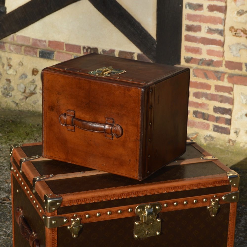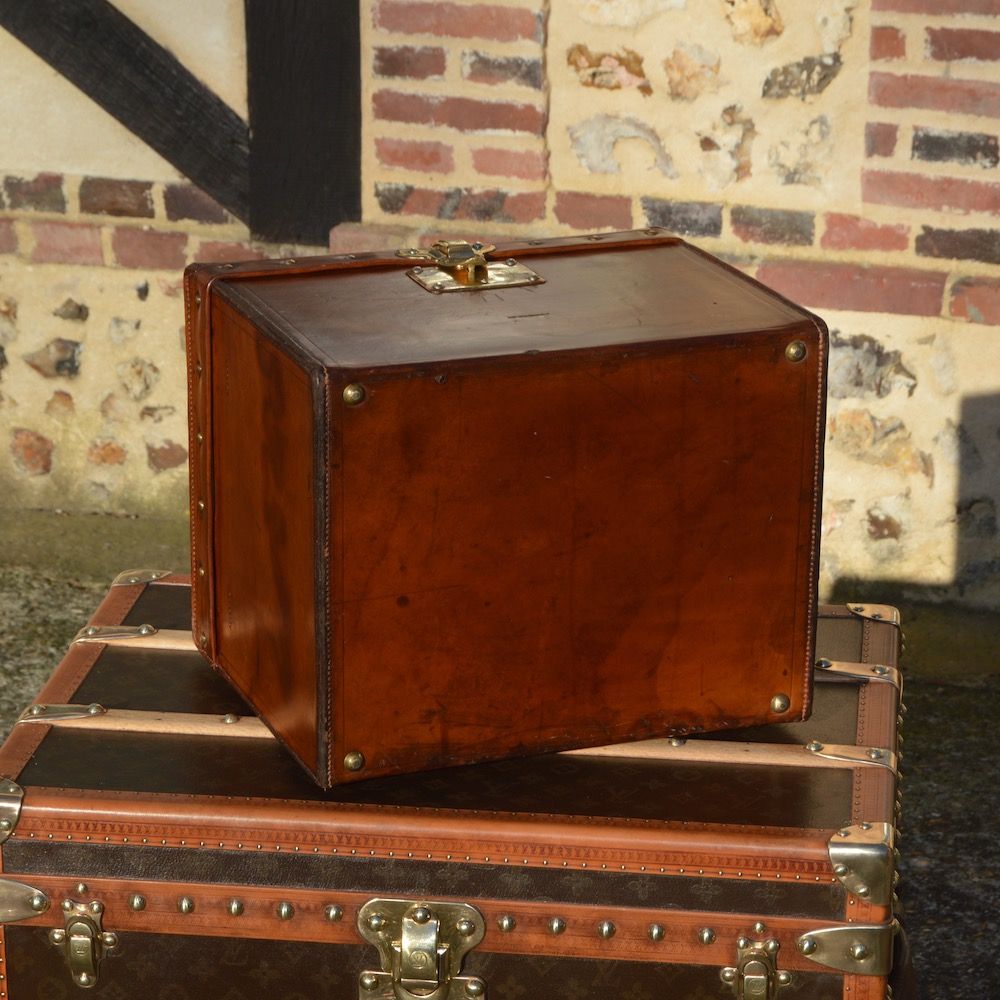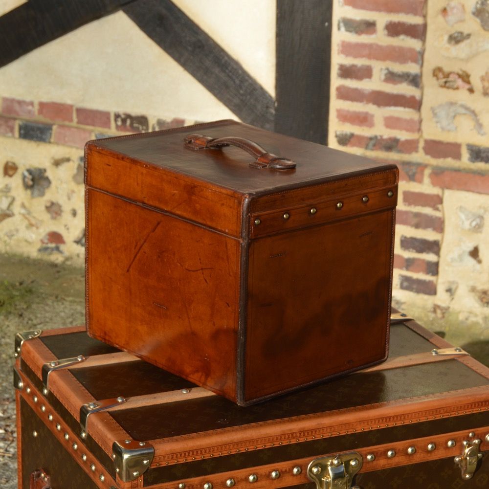 Adorable little Louis Vuitton hat trunk from the 1890s, entirely covered in natural leather with beautiful saddle stitching on each edge.