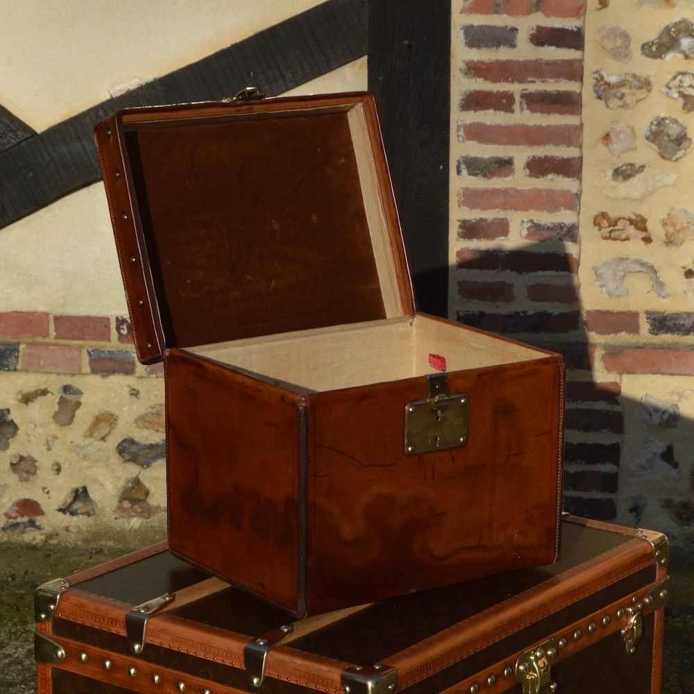 The inside of the trunk is lined in linen, with brown felt in the hood. Traces of the original fastenings can be seen, enabling the original owner to carry a Mellon hat, a Haut de forme hat and a Canotier, for all kinds of travel and in complete safety.