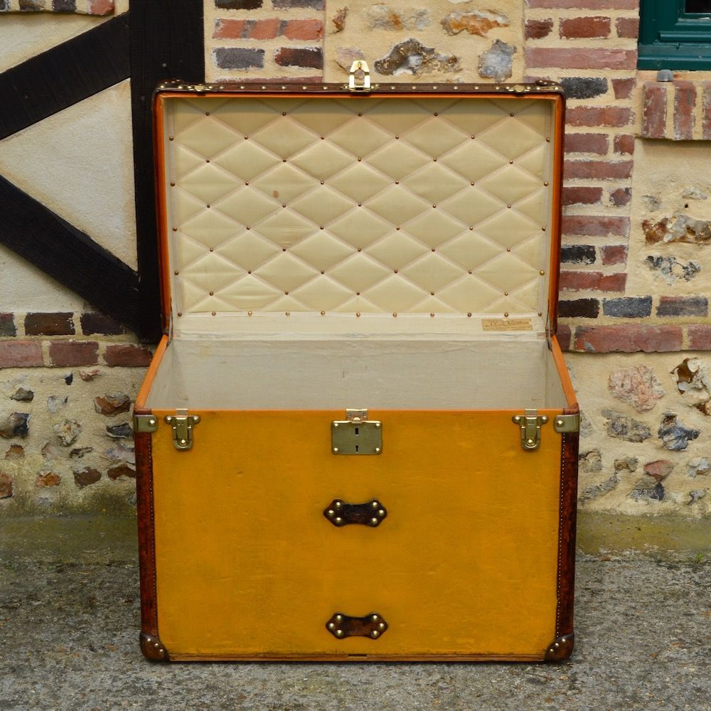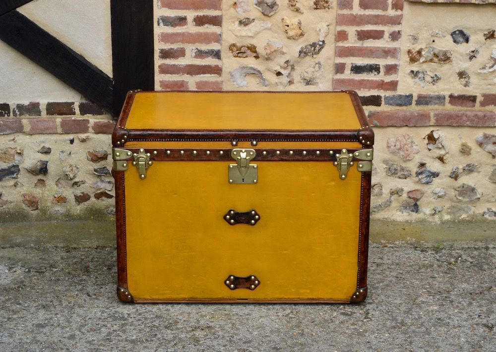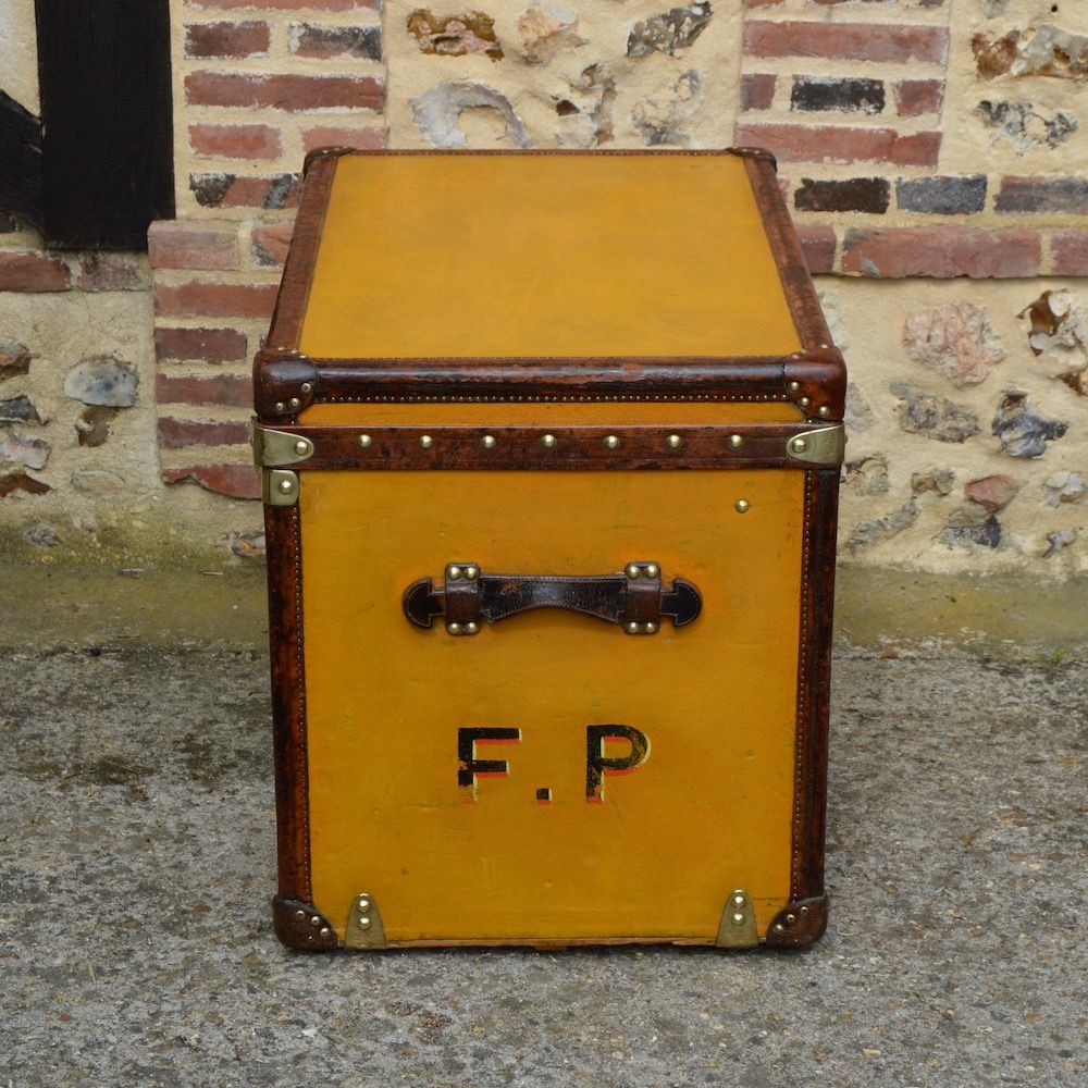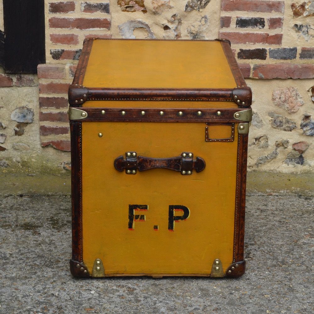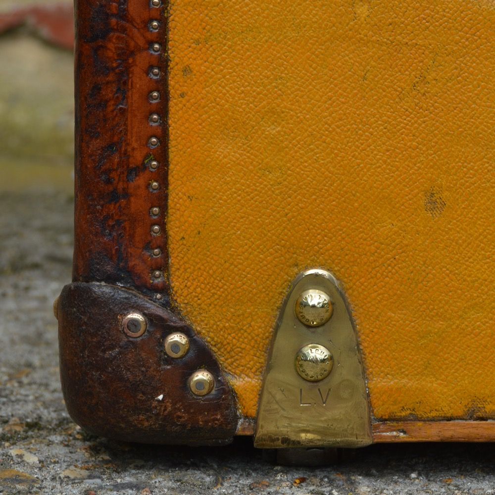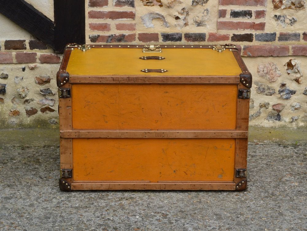 Beautiful 1912 Louis Vuitton hat trunk covered in orange Vuittonite canvas and protected by leather trim. The canvas has changed color over the years, so today's trunk is almost entirely yellow. Only the parts protected from the sun or the elements have remained orange (underside of the trunk and inner edge). The patina created by the passage of time means that we can now present you with an unusual trunk in a superb color.