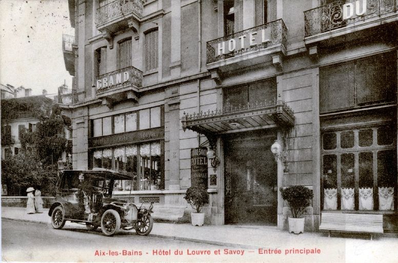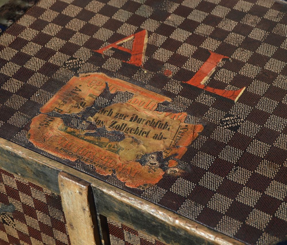 On the left side is a label from the Grand Hotel du Louvre in Aix-les-Bains, as well as a German rail transport label. The initials of the original owner, A.L, are painted in red on each side.