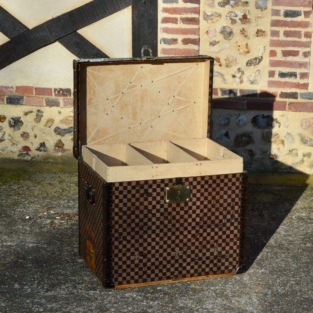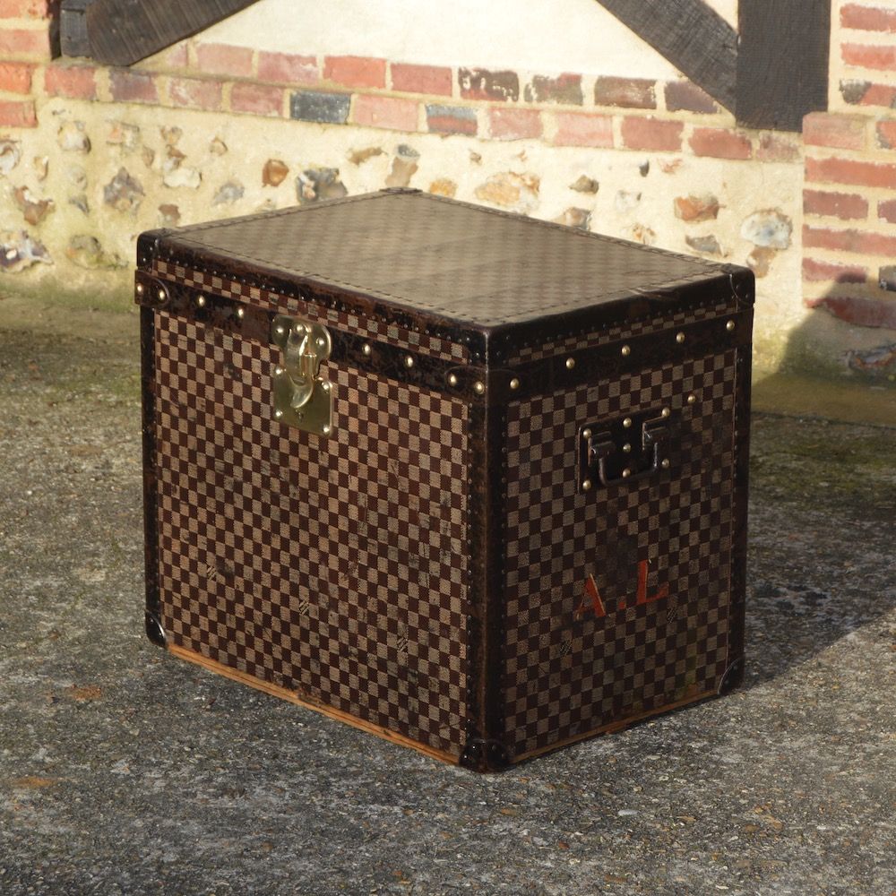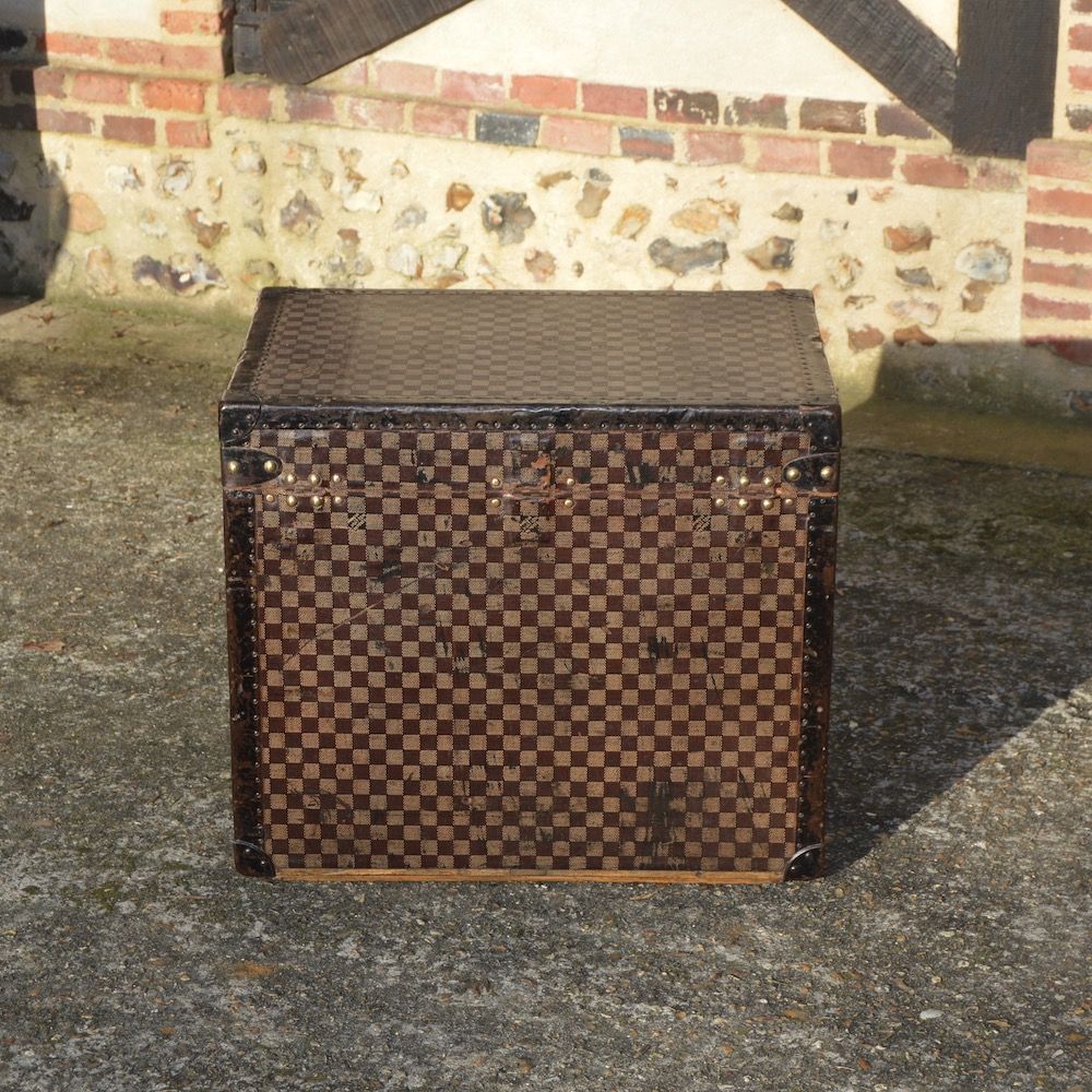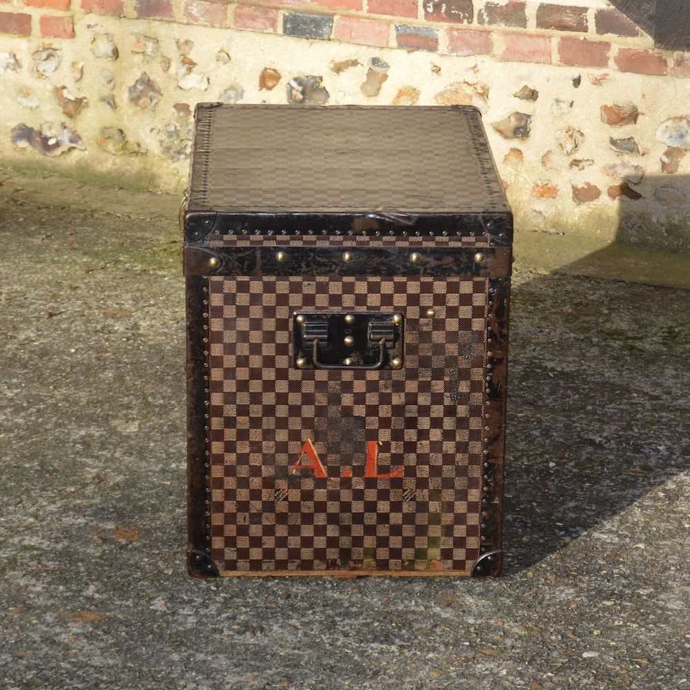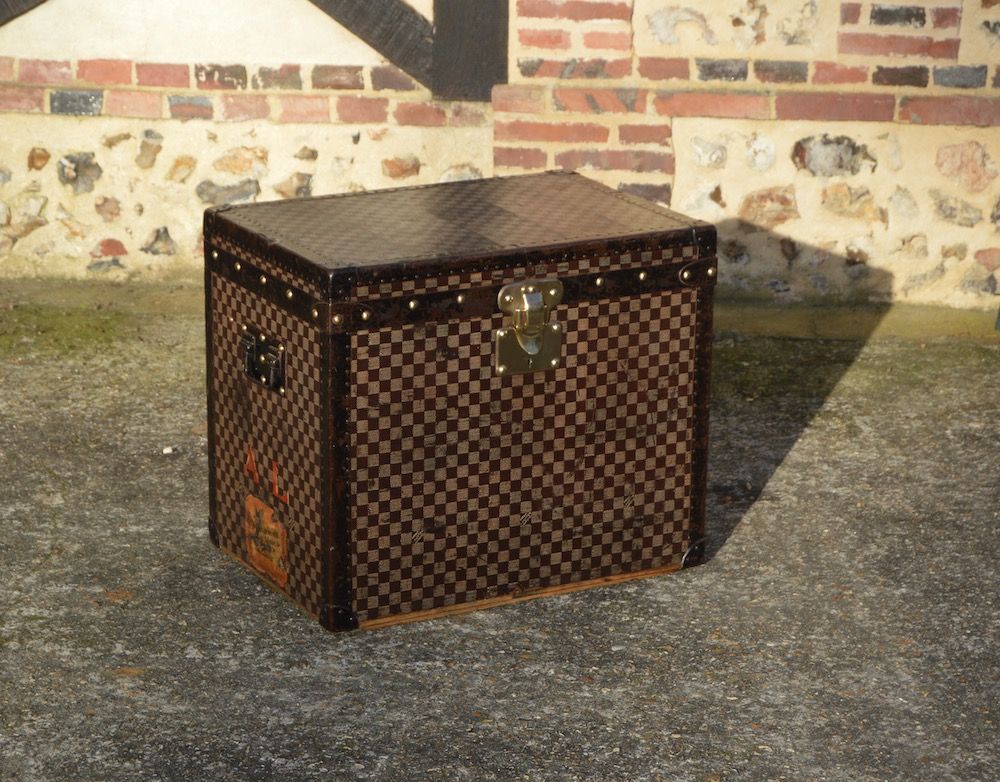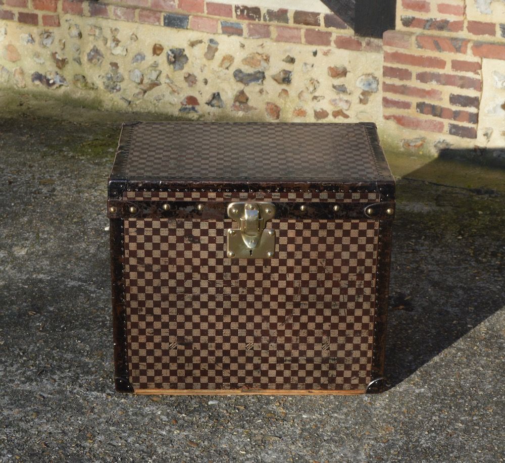 Interesting 1892 Louis Vuitton hat trunk, covered in the emblematic LV Damier fabric and protected by metal trim. It features a central brass lock stamped "Louis Vuitton Paris" and 2 black handles marked "LV". This canvas invented by Louis was proposed from 1888 to 1896, historically the brand's first patented canvas.
