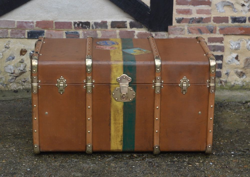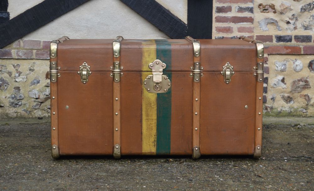 Curved wooden trunk "colonial" type of the 1910s, covered with a brown monogrammed canvas.
