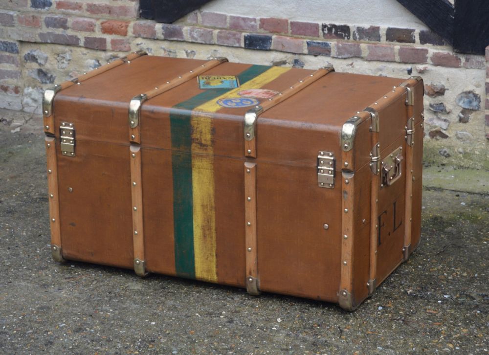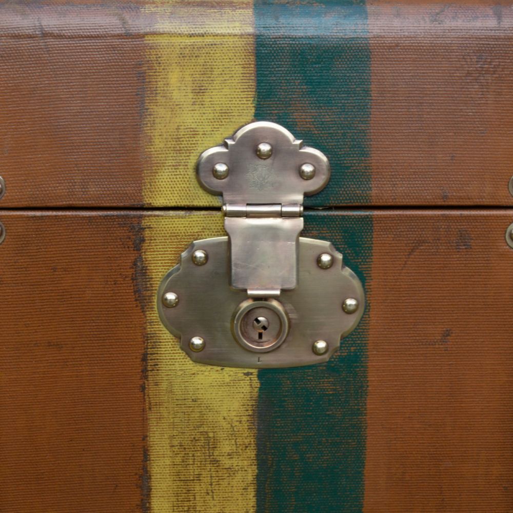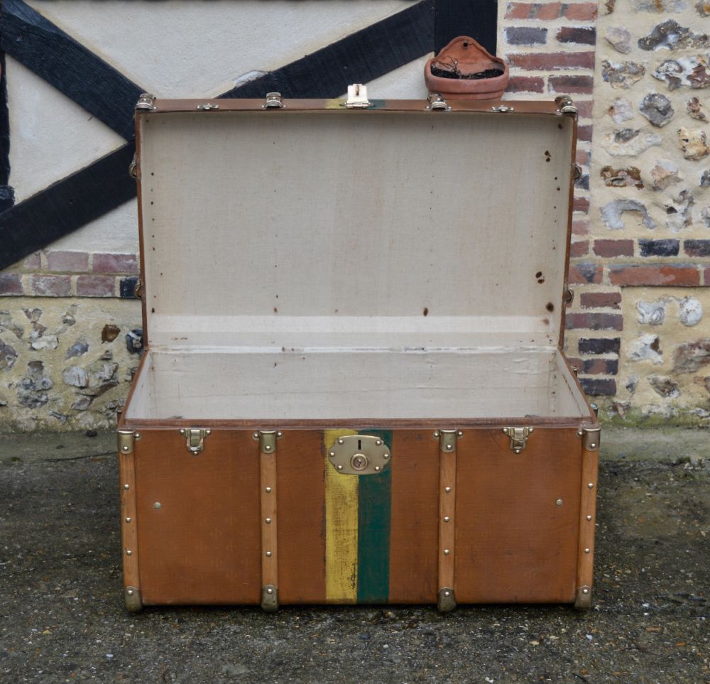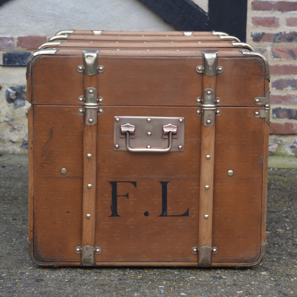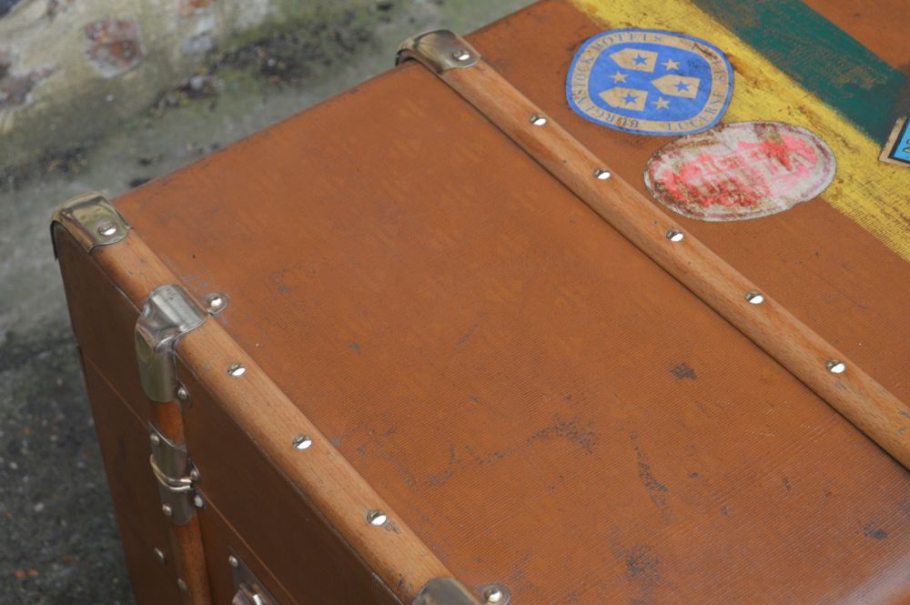 Nice curved colonial mail trunk covered with brown monogram canvas, in very good condition. There are two family colors green and yellow, some hotel labels on the top and the initials "F.L" on each side. Very nice model, sought after at the time for its lightness.