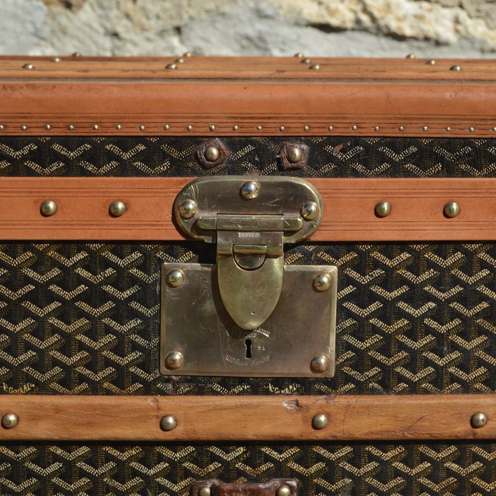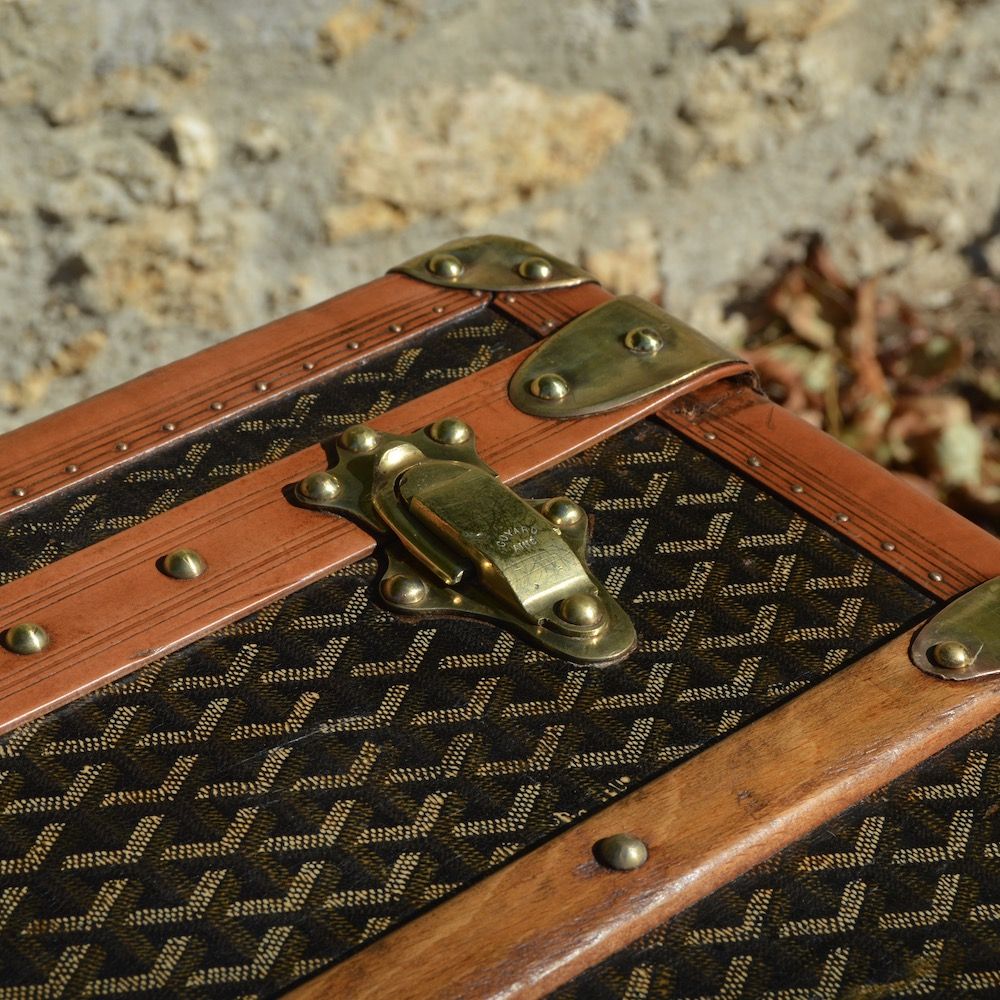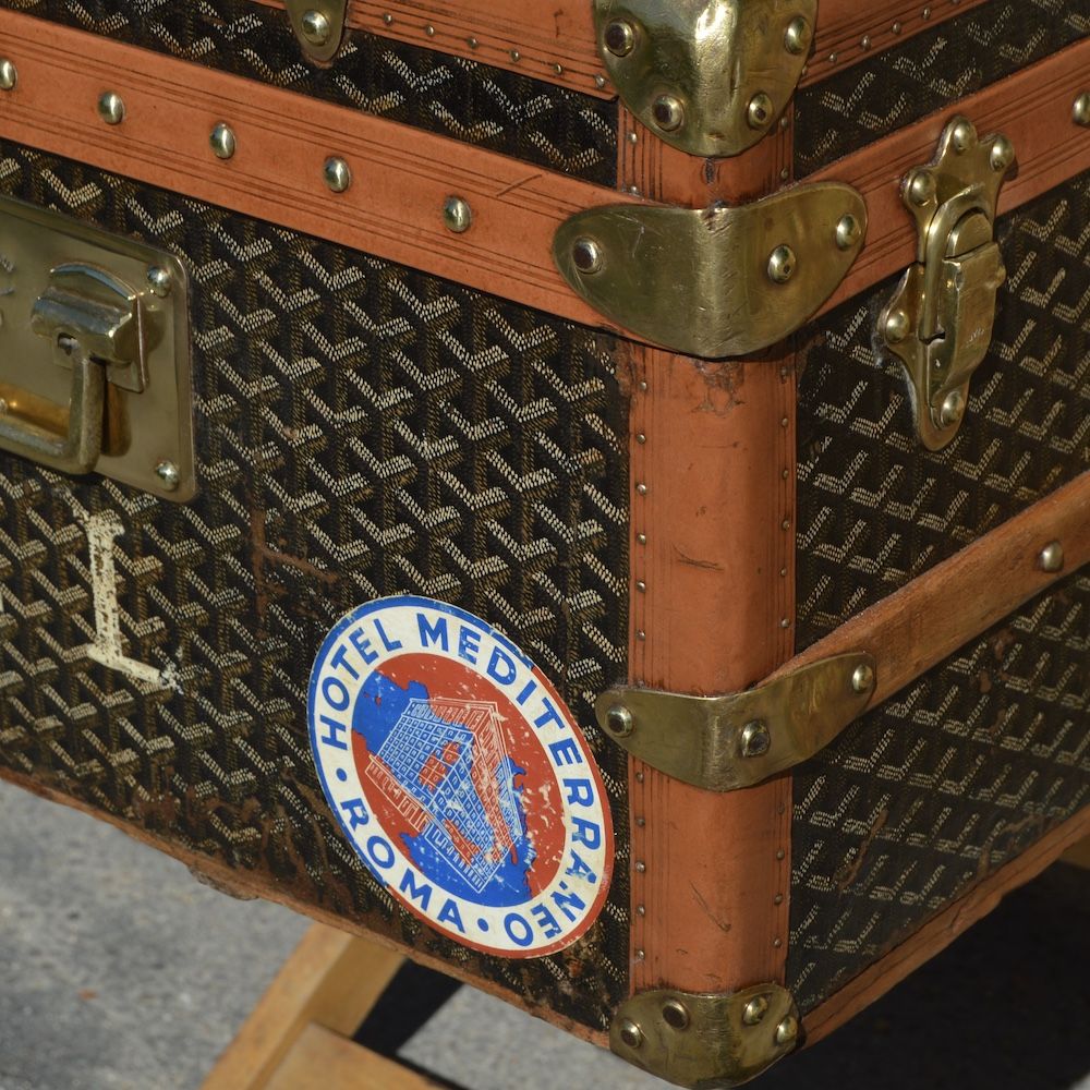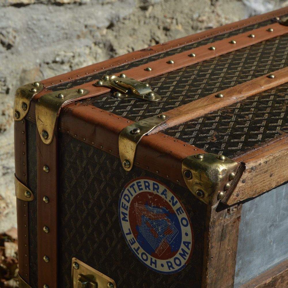 Superbe malle cabine Goyard des années 1920 recouverte de la toile goyardine et protégée par des bordures lozine. Ce bagage est équipé de bijouterie en laiton, avec trois fermoirs et deux poignées estampillées E. GOYARD AINE PARIS, avec l’adresse du 233 rue Saint-Honoré. On remarque également les initiales du propriétaire d’origine I.L peintes en blanches sur chacun des côtés, ainsi qu’une étiquette de l’hôtel « mediterraneo » à Rome. Nous avons trouvé cette malle aux USA.
