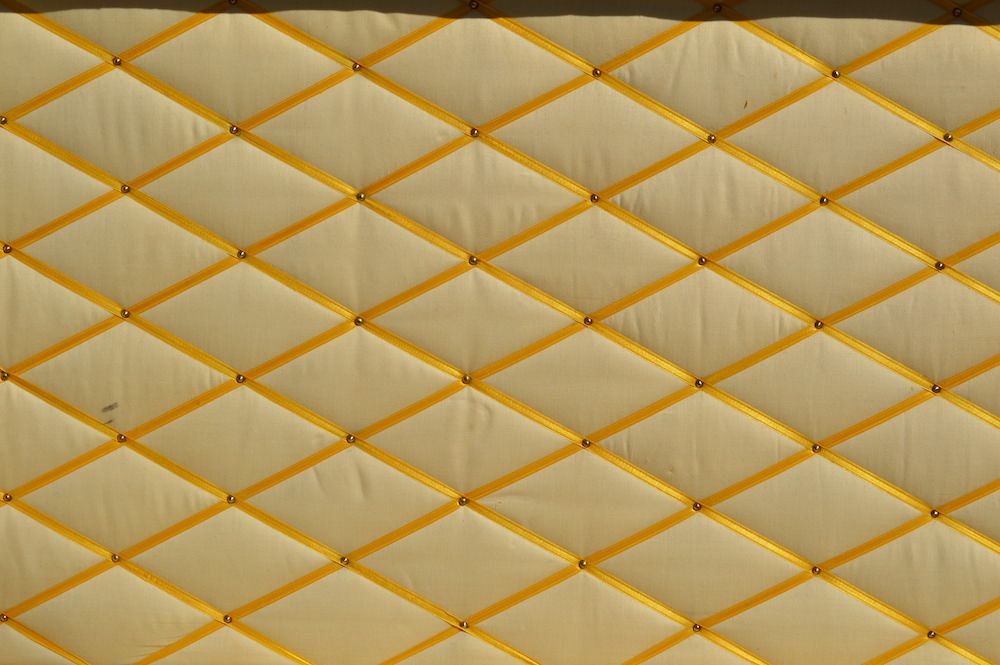 L’intérieur de la malle est recouvert d’une toile de lin écrue, avec un capitonnage jaune fixé dans le capot. Ce capitonnage permettait aux clients de fixer des photos et des lettres à l’intérieur du bagage.