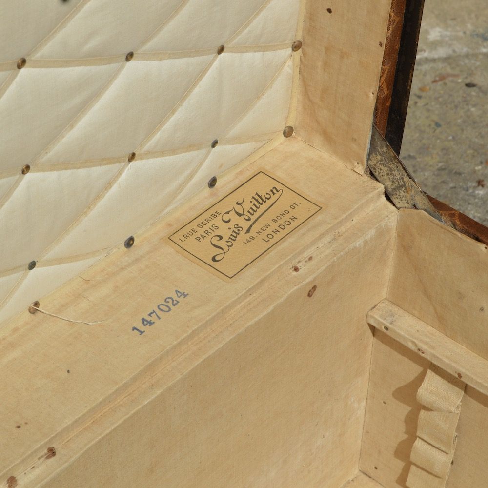 This trunk features the emblematic jacquard woven fabric, the first monogrammed covering used by the Louis Vuitton house from 1896 to 1904. This fabric is very fragile and rarely produced, and today is particularly difficult to find in good condition. The clasps are in brass, while the jewelry is metallic (Moorish finish). The central lock is signed Louis Vuitton and numbered, with the address of the stores at the time. The initials of the owner G.L are painted on each side.