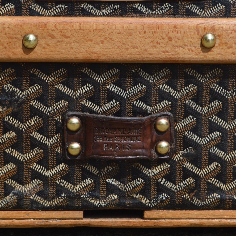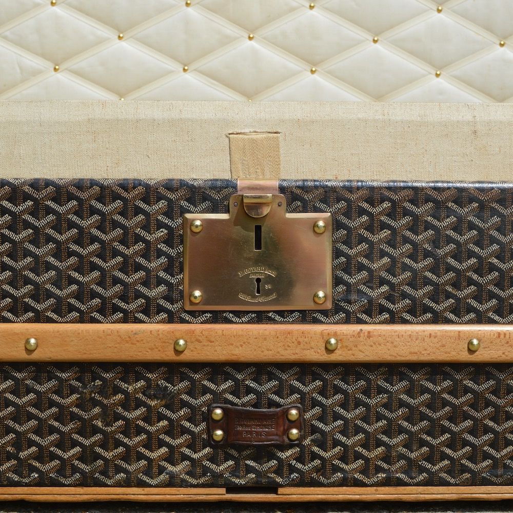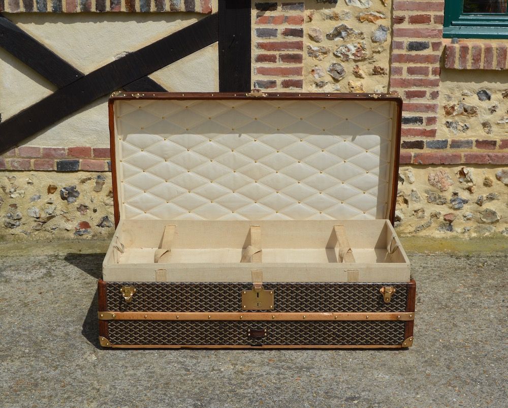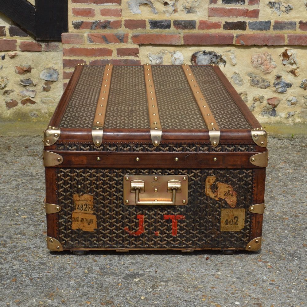 Very good condition: The trunk is in superb condition for its age, with a beautiful patina of leather and shiny brass parts. The Goyardine canvas is slightly marked, but overall in very good condition for its age. The interior is very clean, with a few fine marks.