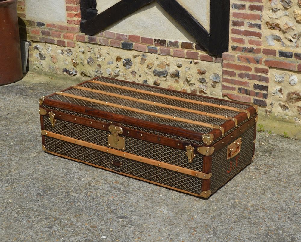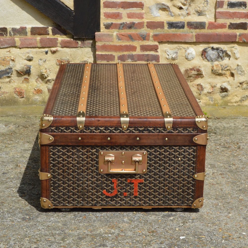 These trunks disappeared from Louis Vuitton or Goyard sales catalogs when the airplane supplanted the liners in the immediate post-war period. For lack of traveling today with these cabin trunks, their format is ideal to make a coffee table. Often protected by a glass, it is the assurance of having an unusual table, full of history and symbol of an art of living at the beginning of the 20th century.