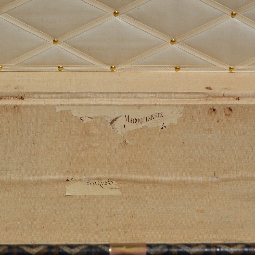 The interior is covered with a coated cotton canvas, with padding to hold the original customer's photos between the ribbons when traveling. The upholstery has been restored to its original condition. Fragments of the Goyard manufacturer's label glued into the vat can be seen, with the beginning of the address visible "233 rue St-...". After numerous manipulations over the years, it is not uncommon today for these interior labels to have disappeared. The original interior frame is still present, along with the trunk key.
