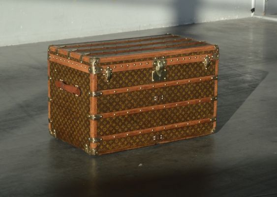 An original leather handle signed Louis Vuitton is attached to the top of the trunk.