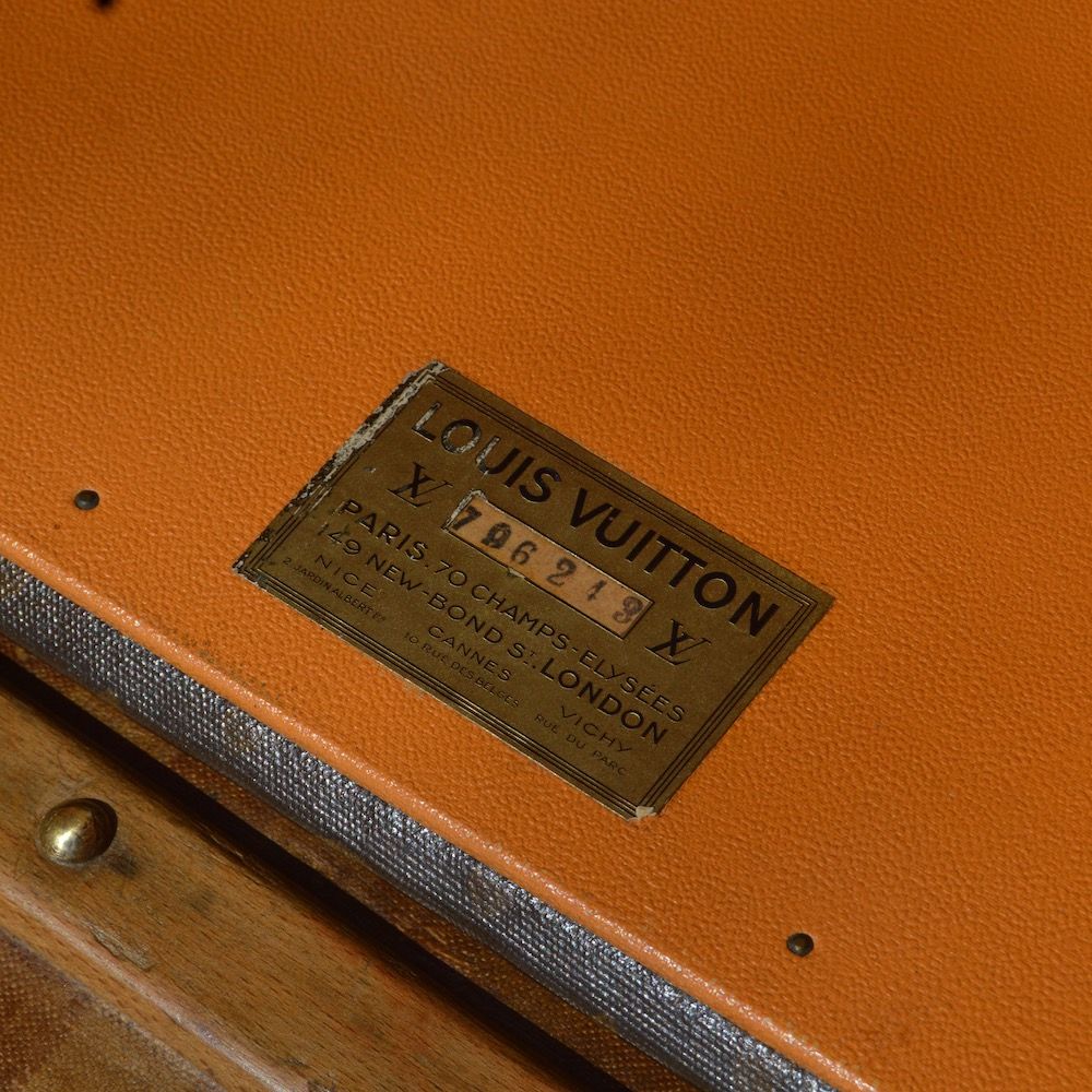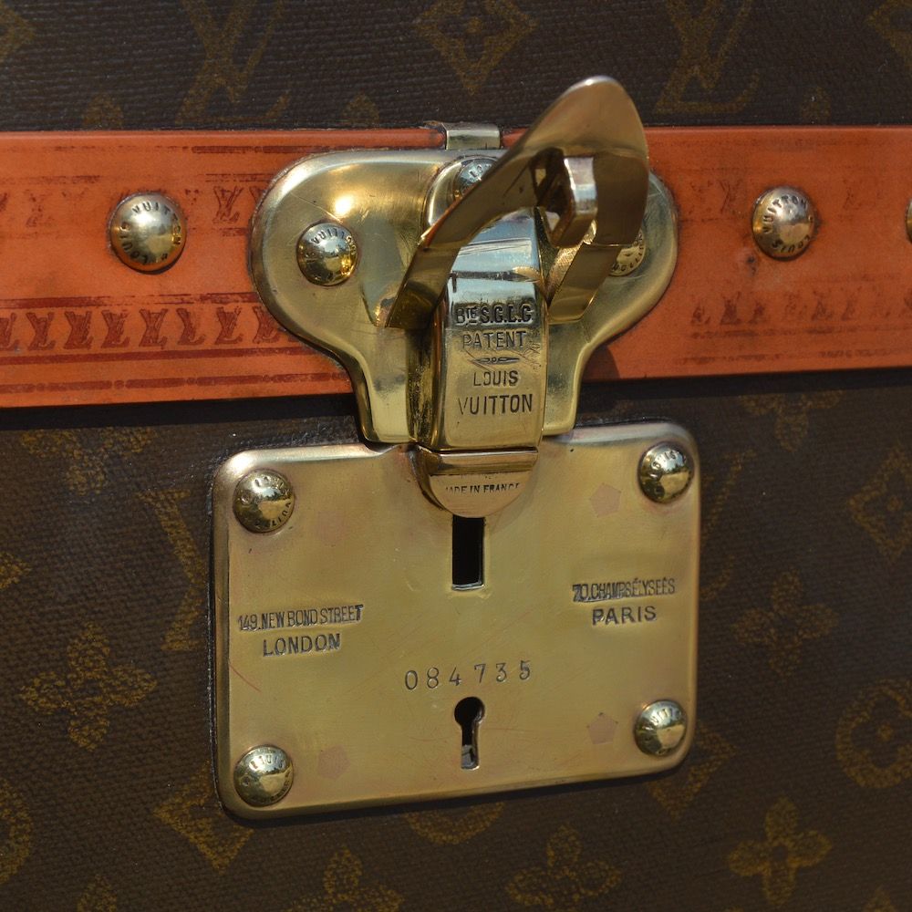 This trunk is covered with the iconic Louis Vuitton monogram canvas and is protected by lozine borders. There are two signed and numbered brass clasps on each side, as well as two brass toads on the front.
