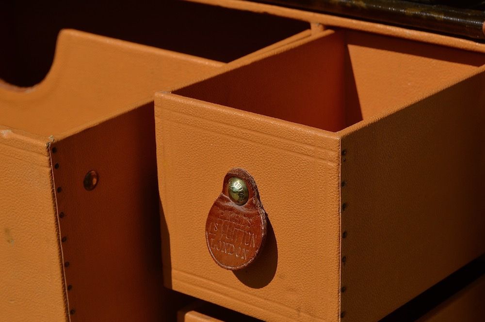 There are seven compartments inside the luggage, with specific places to store books, a typewriter or documents. A mechanical system holds the two top drawers in place to ensure that they stay open when the trunk is opened.