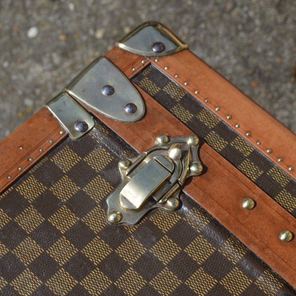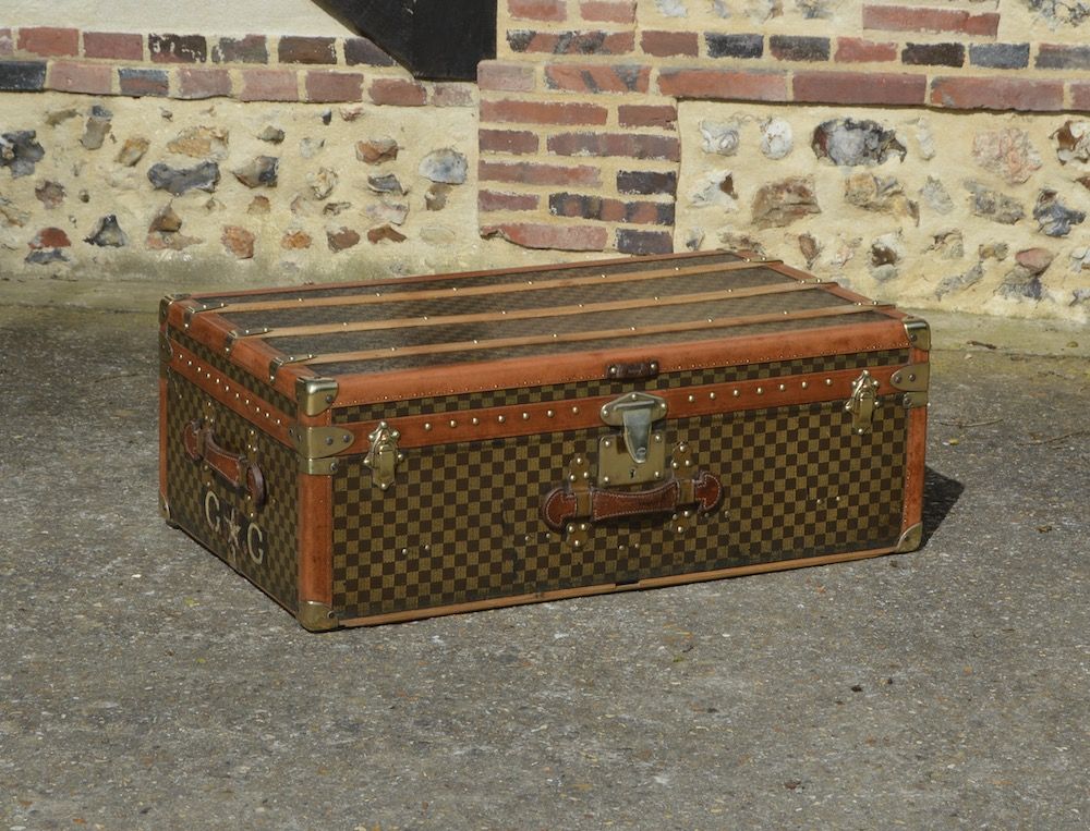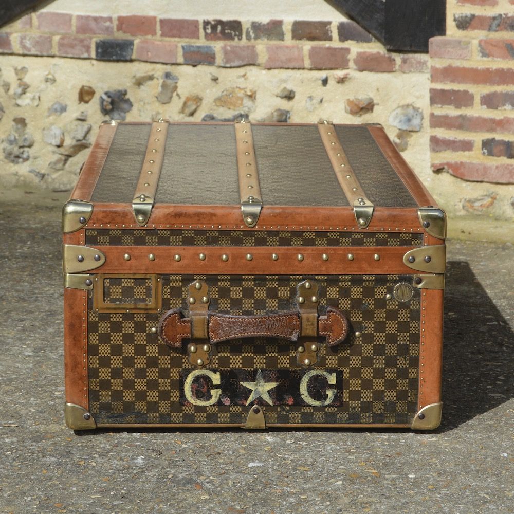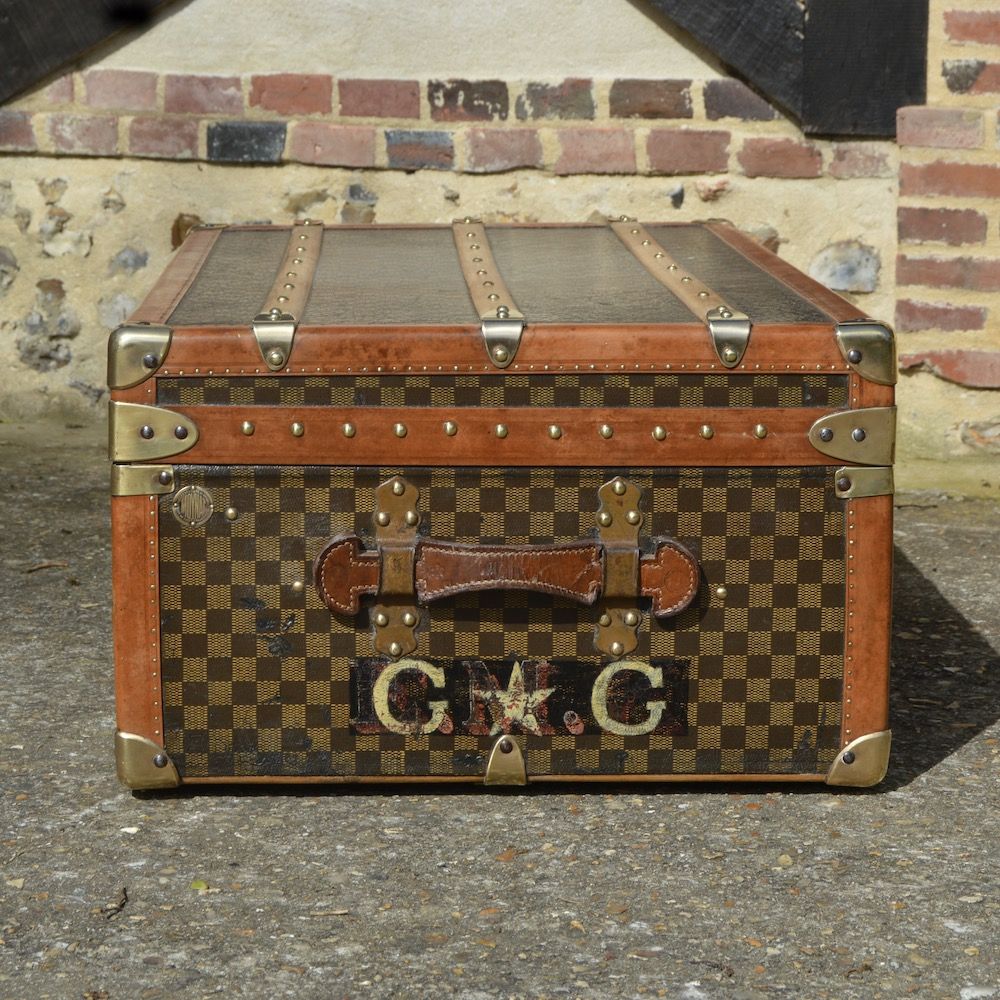 Magnificent Moynat cabin trunk from the 1900's, covered with a checkerboard coated canvas and protected by lozine borders. This trunk has the emblematic brass "cat's tongue" clasp marked Moynat Paris, as well as 2 small brass "toad" clasps. Both sides of the trunk are equipped with leather handles, with the Moynat authentication plates and the initials of the original owner (the new initials G.G were added during his travels).