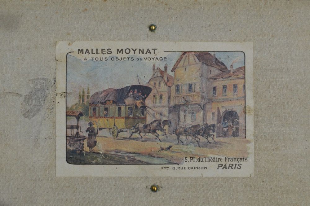 One notices on this special order a double opening on the top and on the front of the trunk. The interior is equipped with a removable frame built on the bias to fit the shape of the luggage. The manufacturer's label is stuck in the hood with the original address of Moynat at 4 place du théâtre Français.