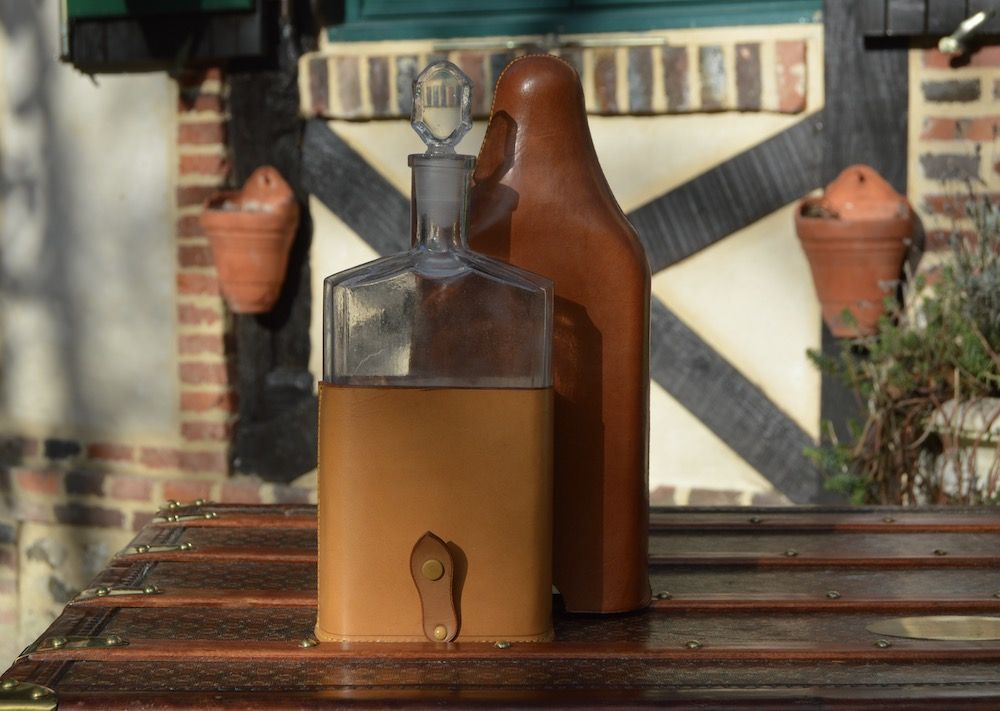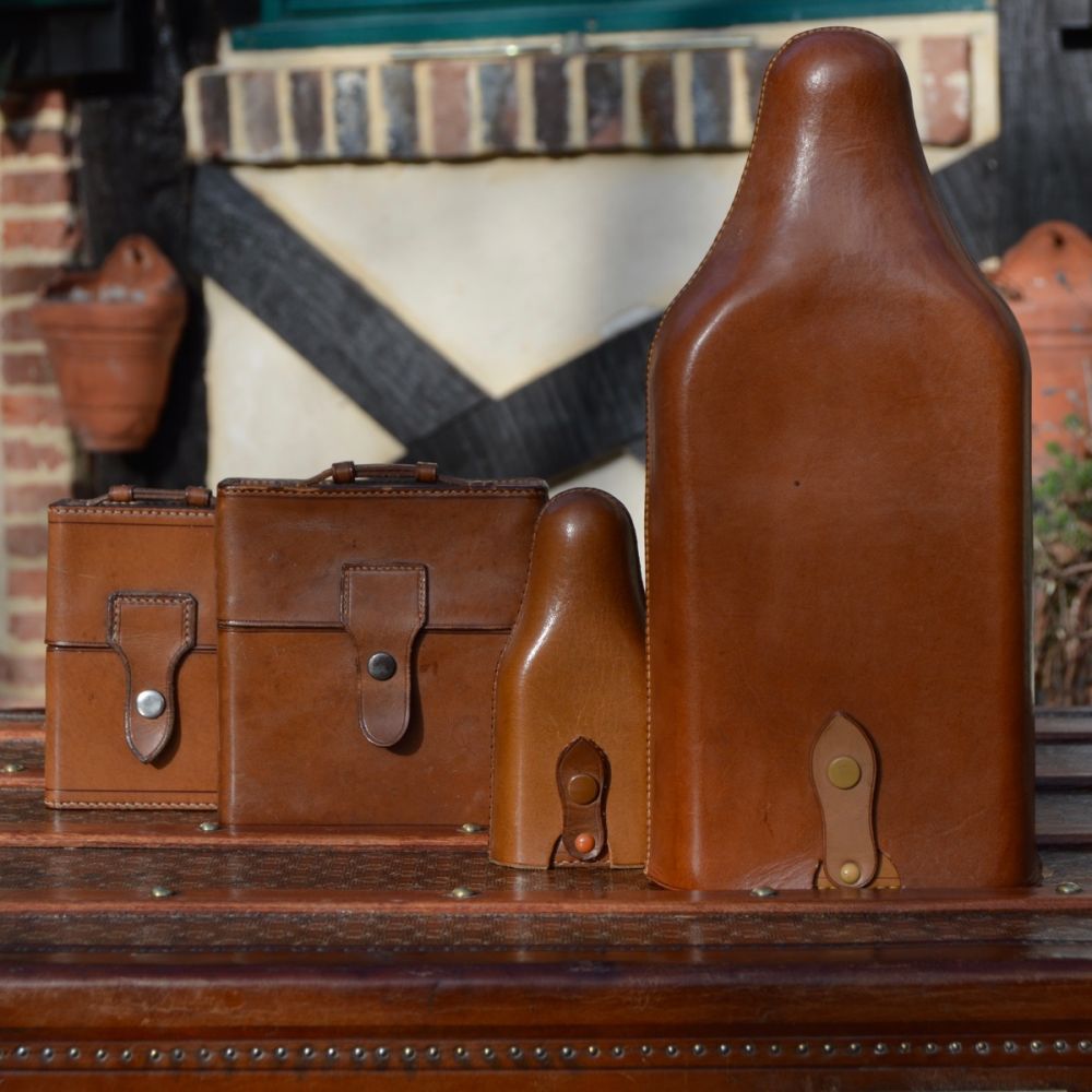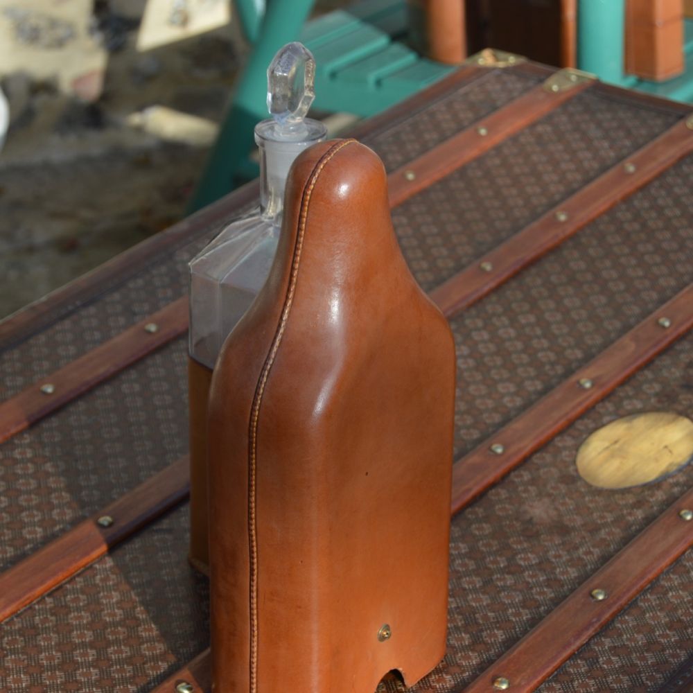 Saddle stitched natural leather bottle case in perfect condition from the 1900s. Glass bottle in very good condition, with a snap on the leather to maintain the protection. Shape numbered "1000".