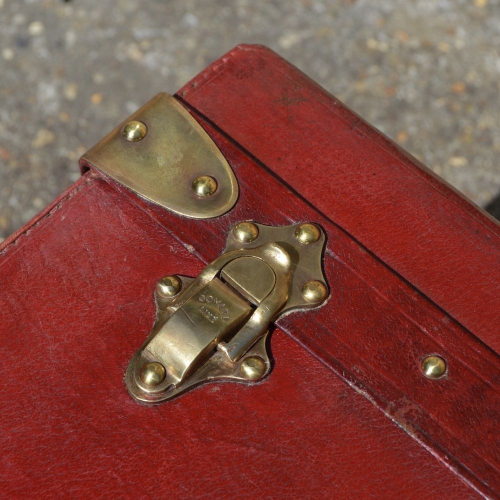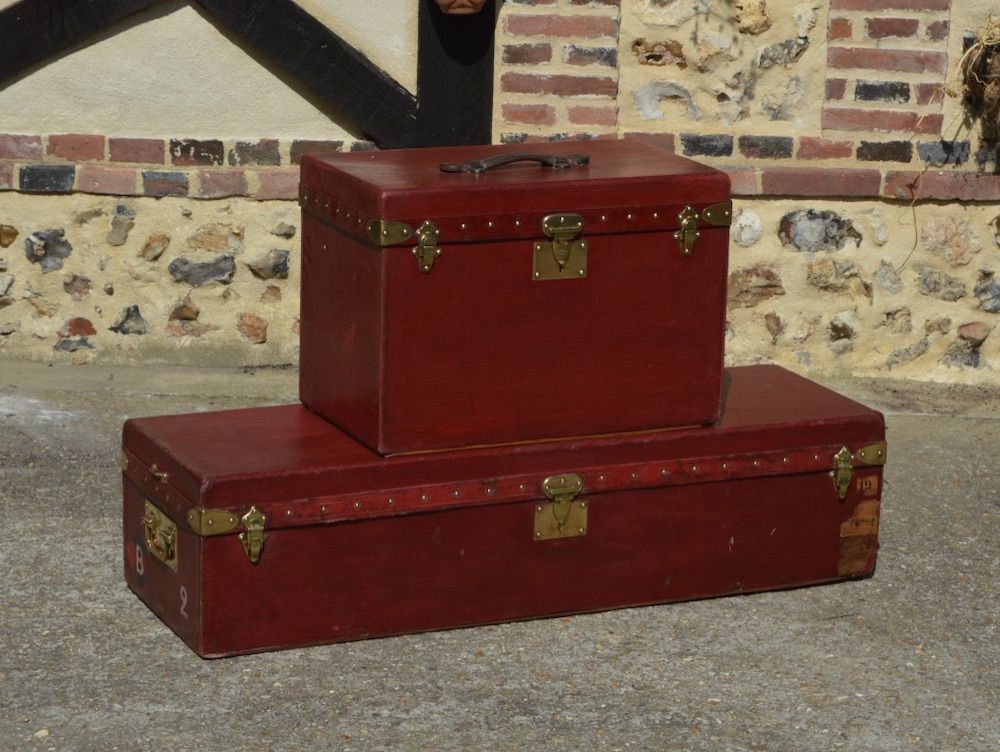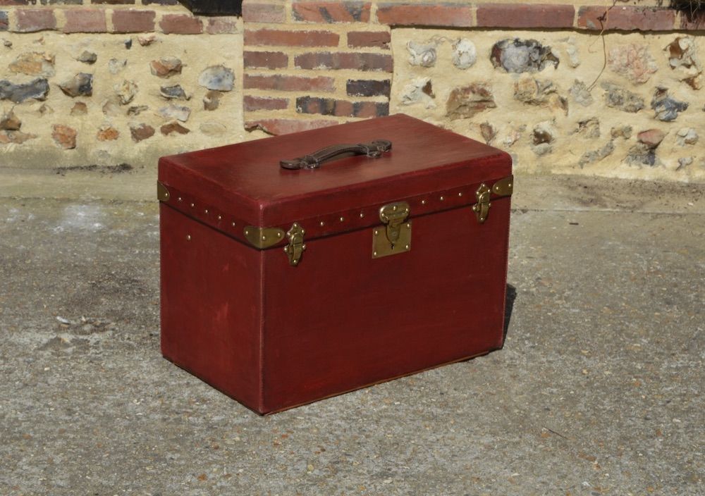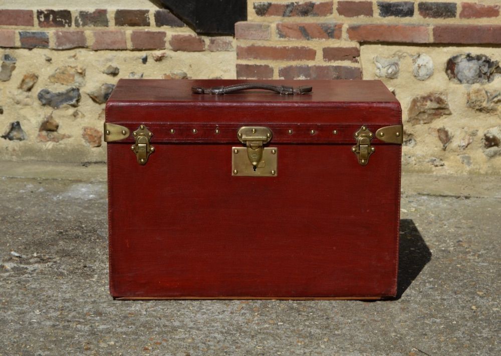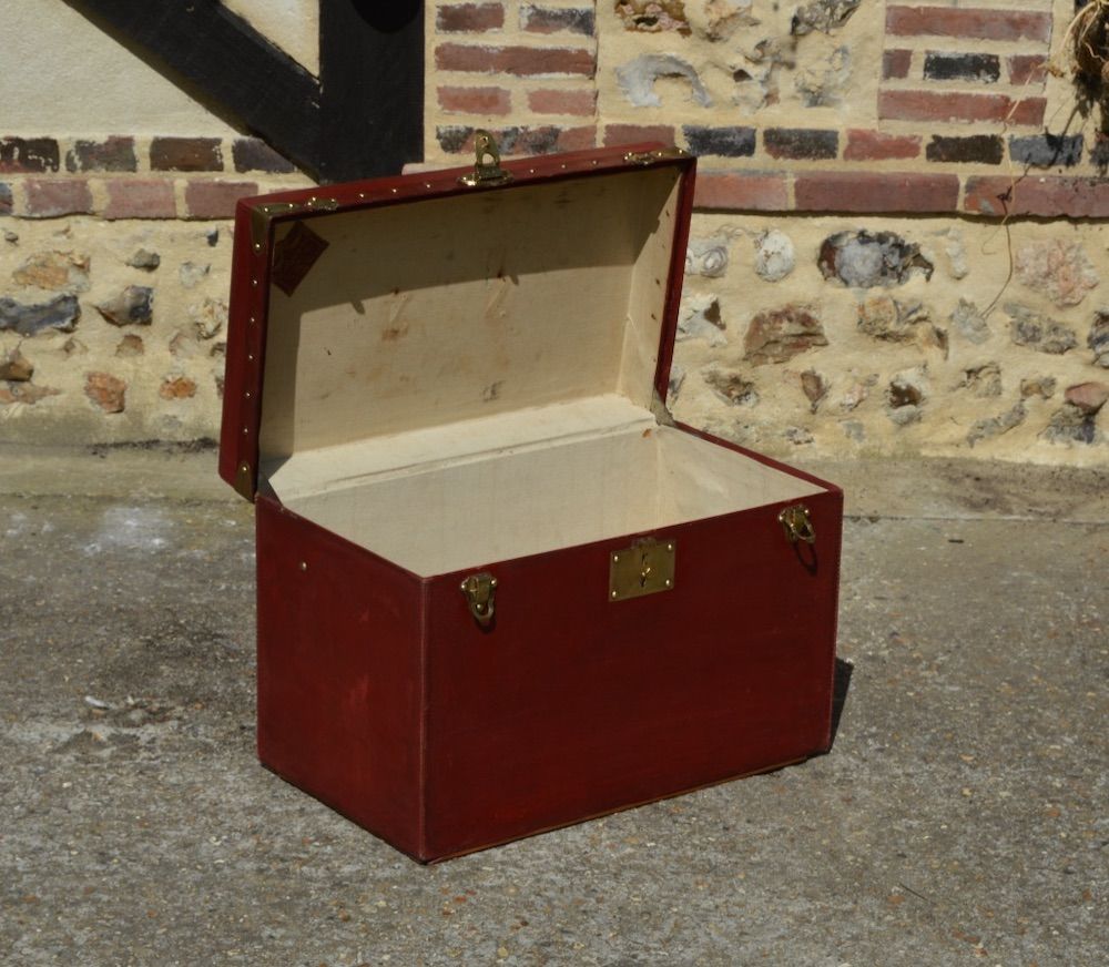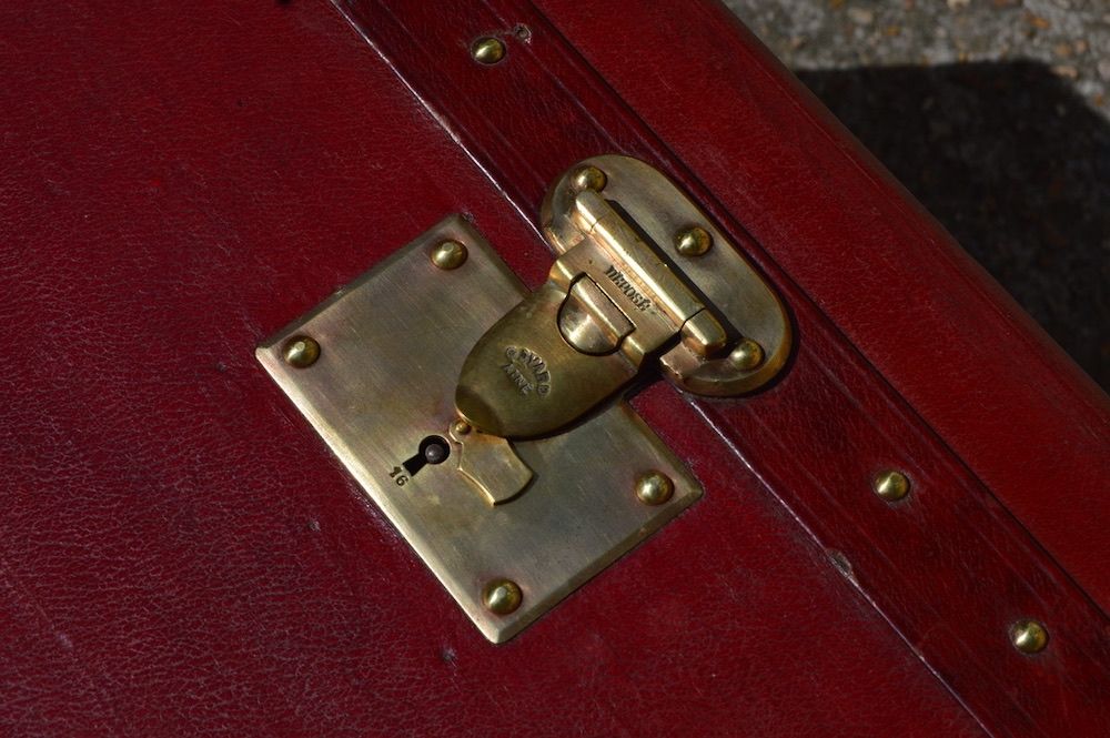 Adorable little Goyard travel trunk covered with a red waterproof canvas. The edges are sewn on a wooden shaft to hold the canvas in the most solid way. Three brass clasps are attached to the front and signed Goyard ainé and brass pieces are nailed to the headband to hold the structure. A leather handle is attached to the top to transform the luggage.
