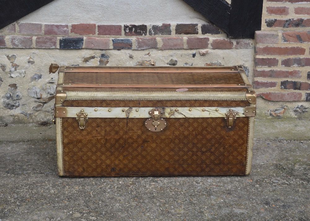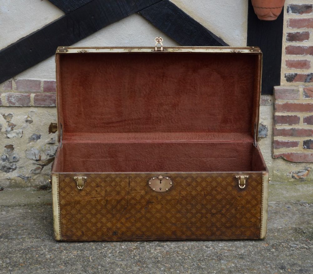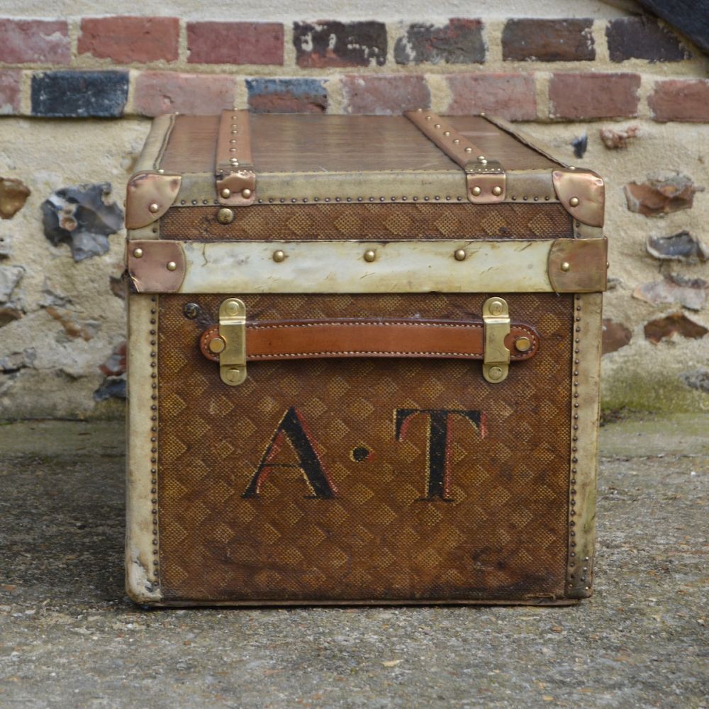 Small trunk from the 1930s covered with a coated canvas with beige checkerboard patterns and protected by parchment borders.