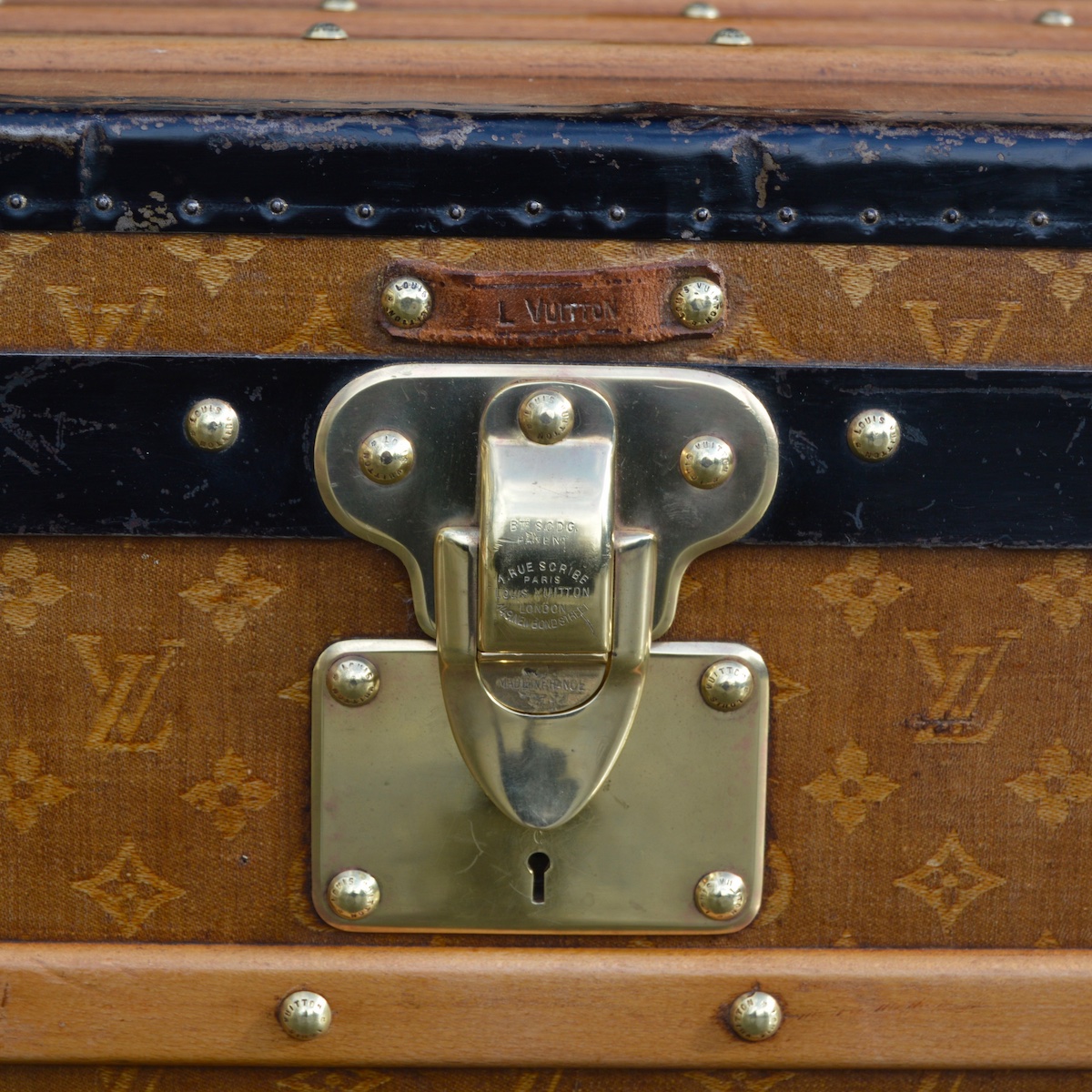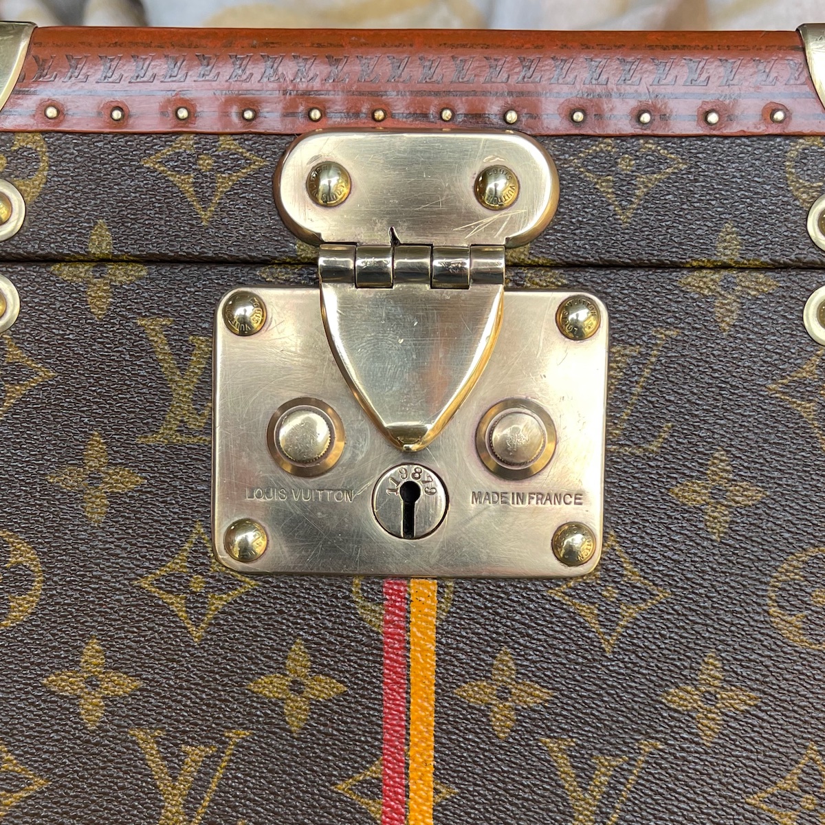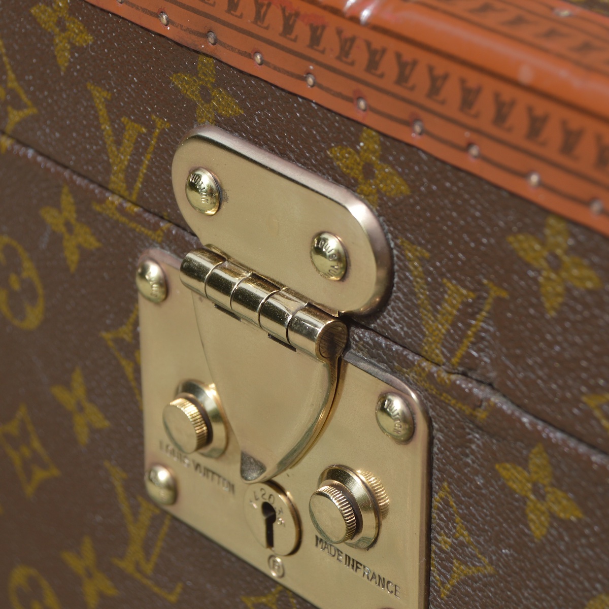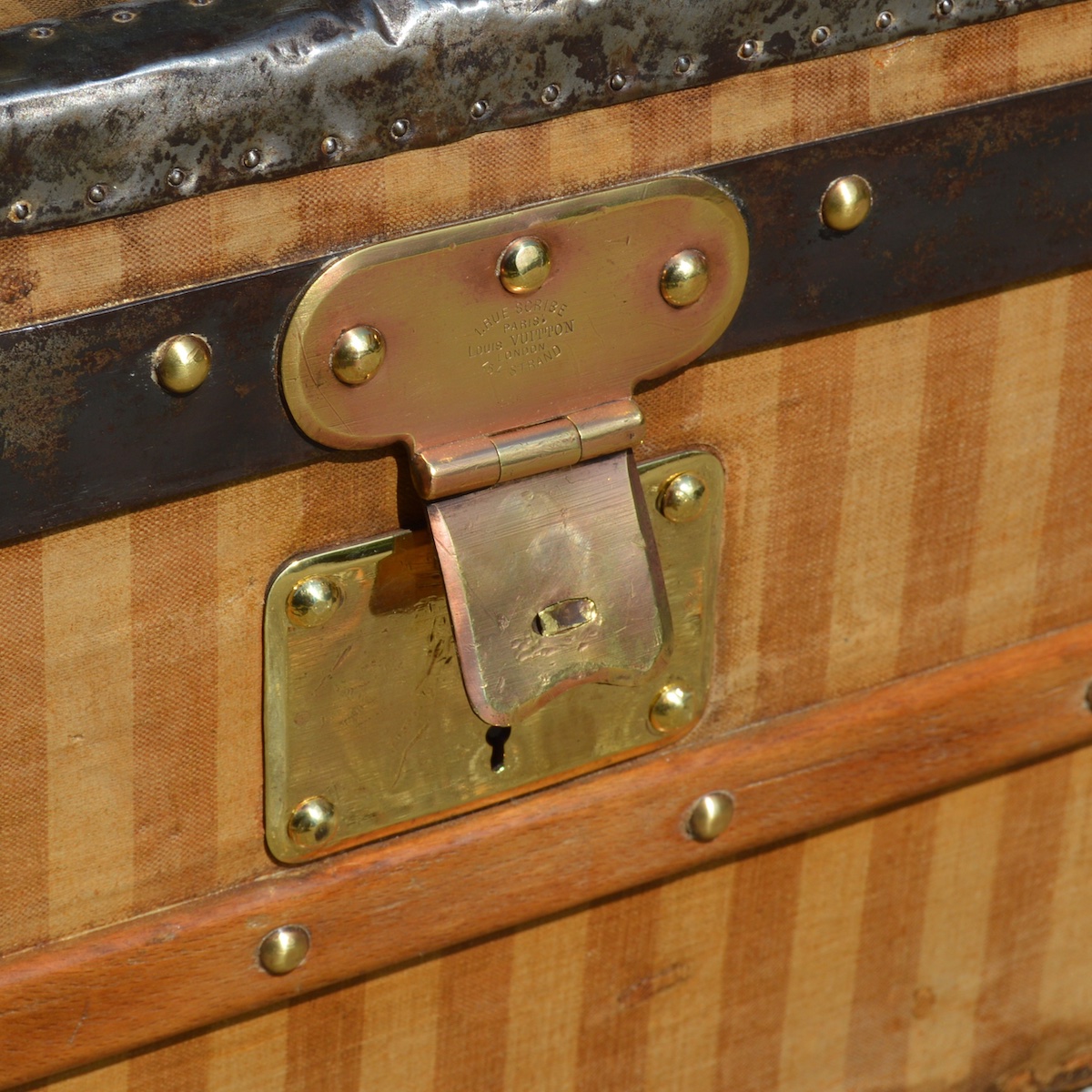As a traditional lock is not possible on a trunk with a front opening, we find clasps in two "folded" parts or "slide" systems to ensure this closure. Whatever the specificity of the trunk, the Louis Vuitton brand name is always engraved in the lock material.