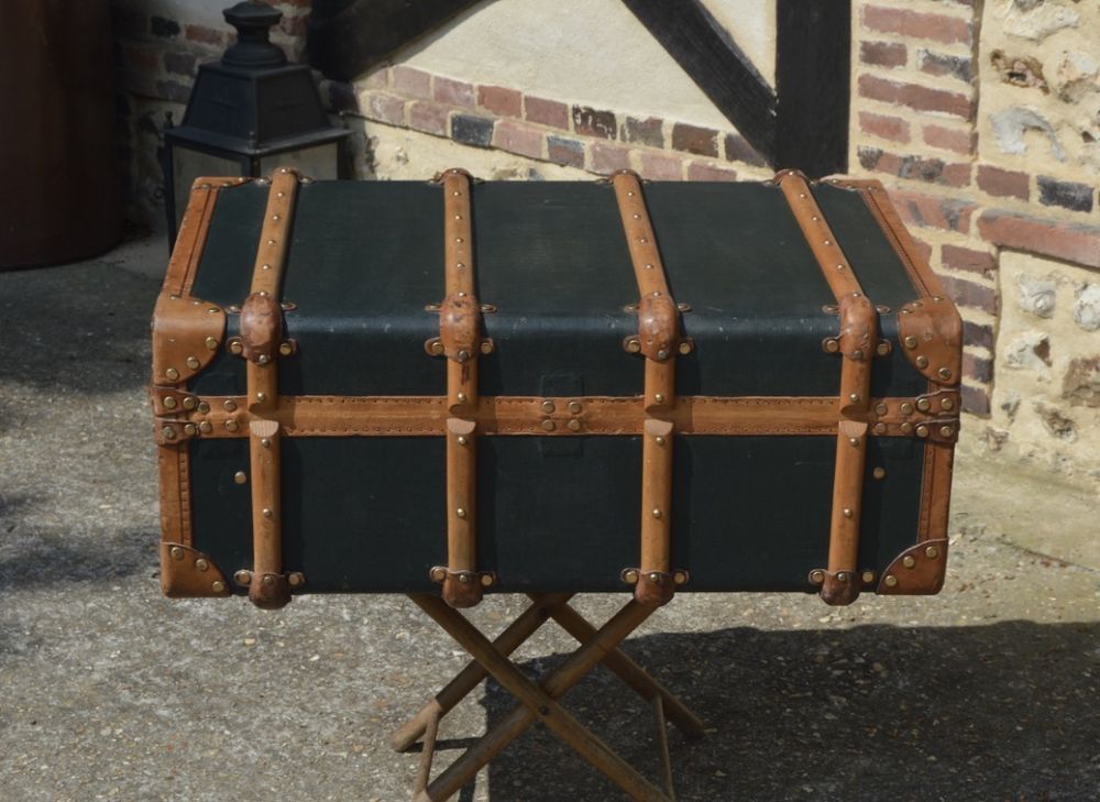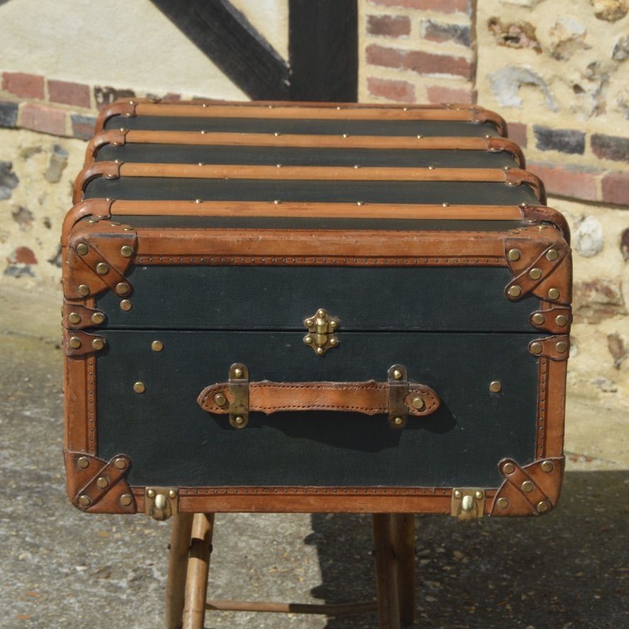 Interesting small curved cabin trunk, covered with a green coated canvas and protected by leather edges. The trunk is equipped with a central lock system of the brand Au Soleil, with wooden reinforcements and three carrying handles. The brass handle on the front allowed the original traveler to retrieve his trunk, once stored under his bunk during a trip.