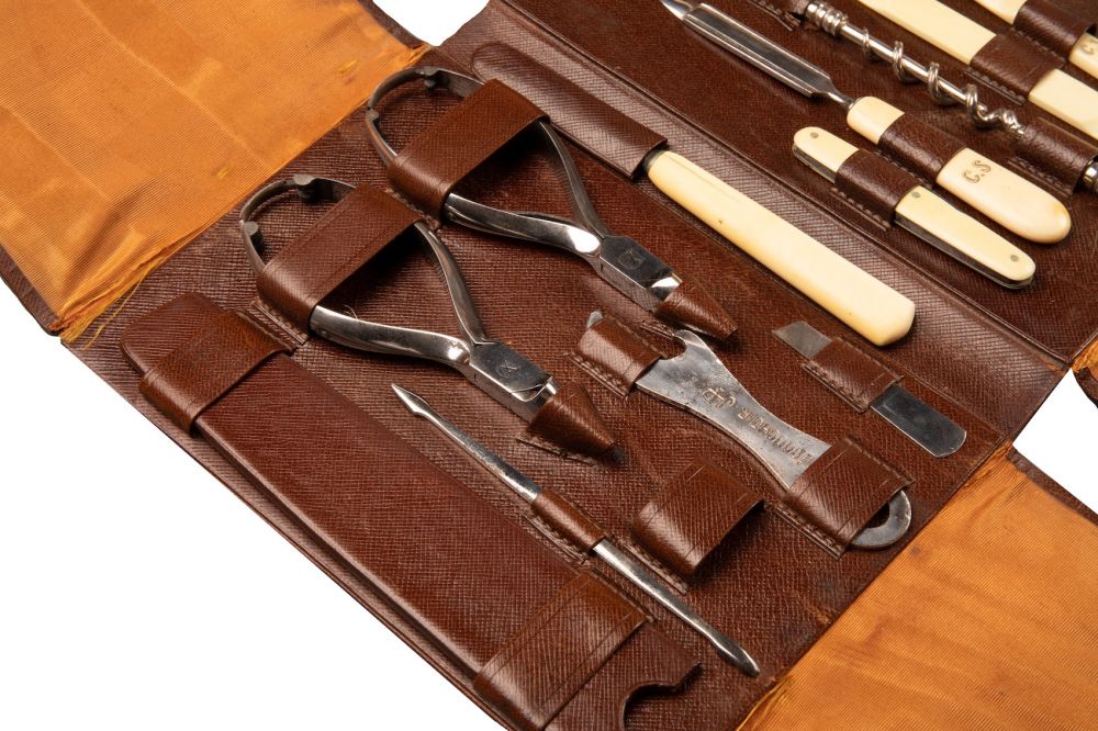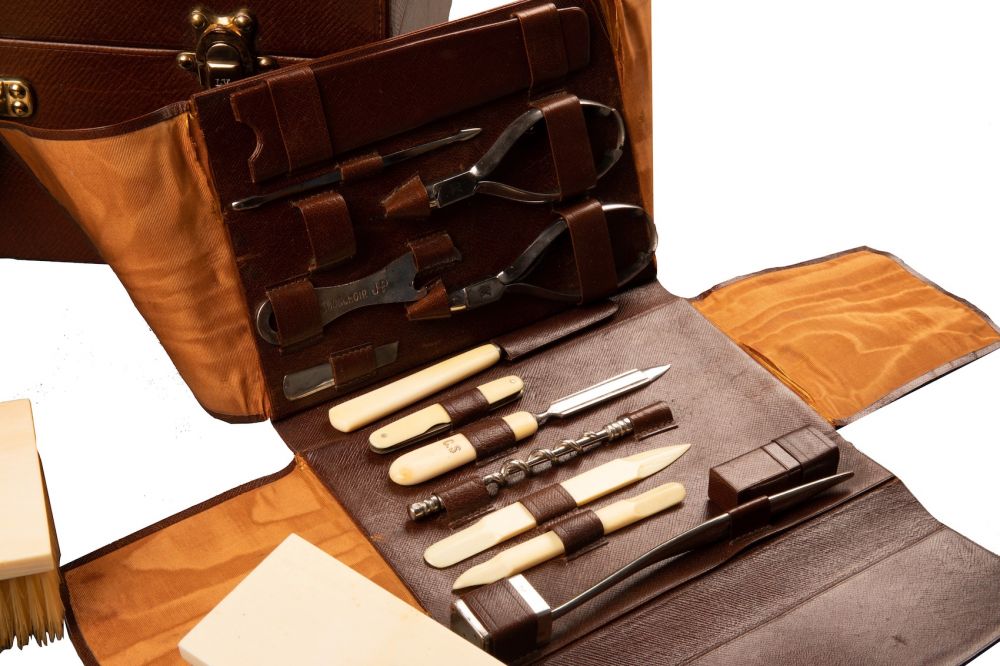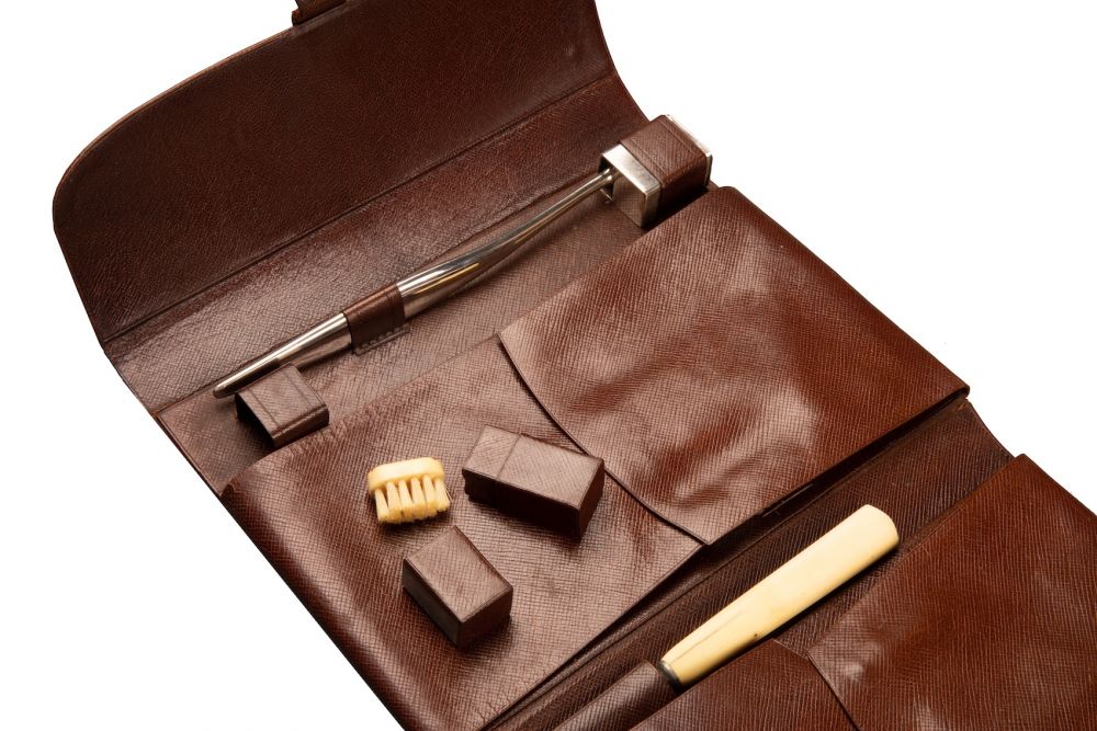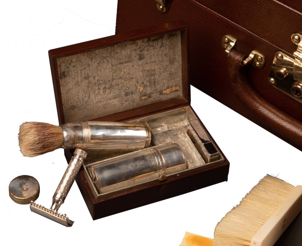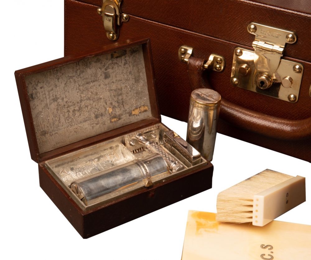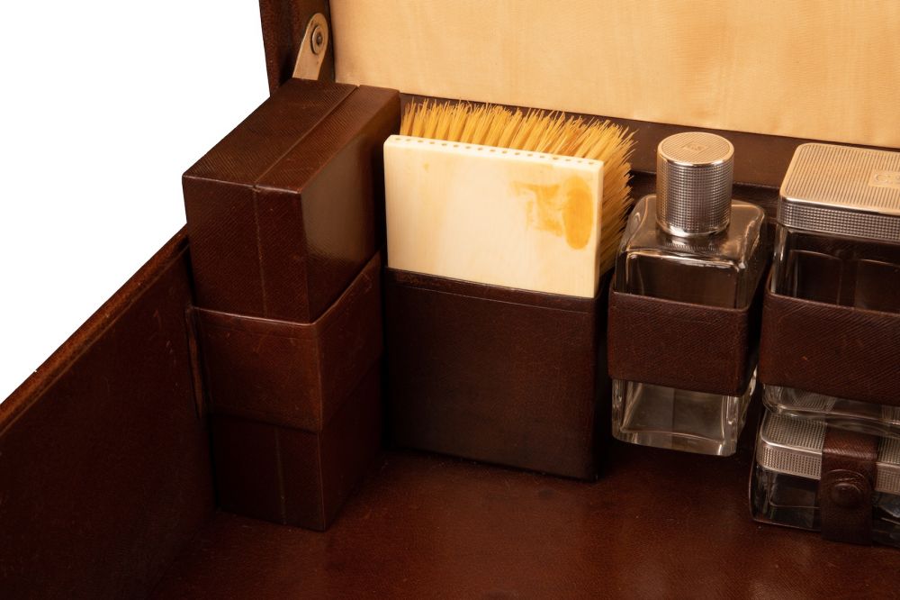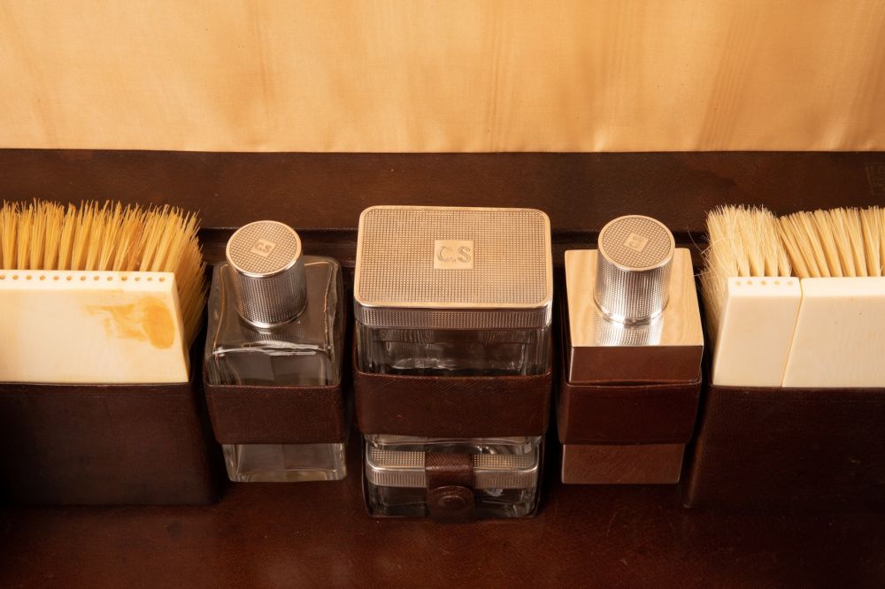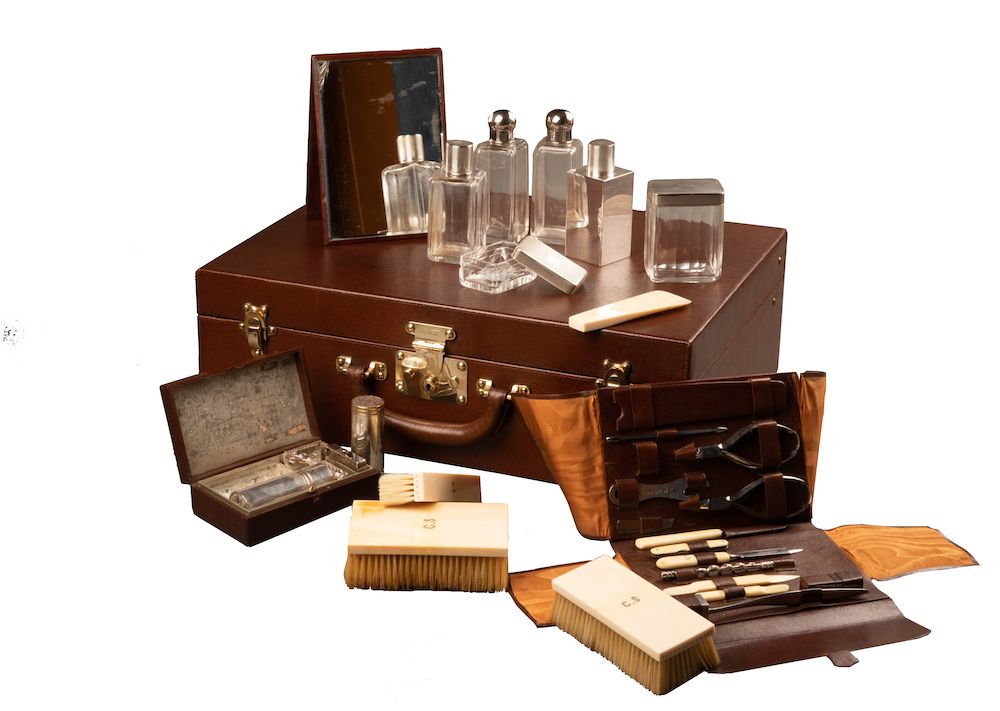 On retrouve à l’intérieur du bagage des flacons pour le parfum, des brosses, des outils de manucure, un chausse-pied, un miroir, la brosse à dents, etc. Tous le nécessaire le plus luxueux de l’époque. La valise est également équipée d’un miroir amovible, ainsi que d’une boîte doublée en aluminium pour l’oxydation et contenant un blaireau, un rasoir et des lames. Toutes les parties en argent sont poinçonnées, avec le monogramme Louis Vuitton sur le couvercle et marquées des initiales du client d’origine C.S.