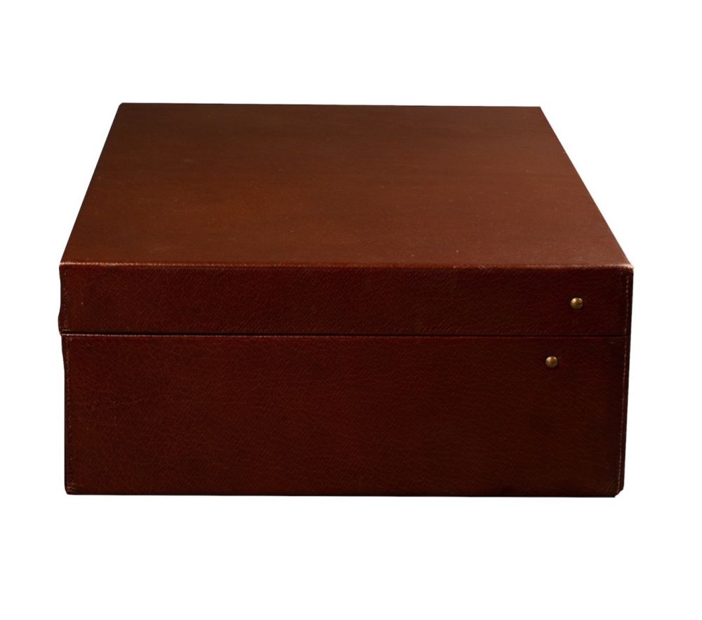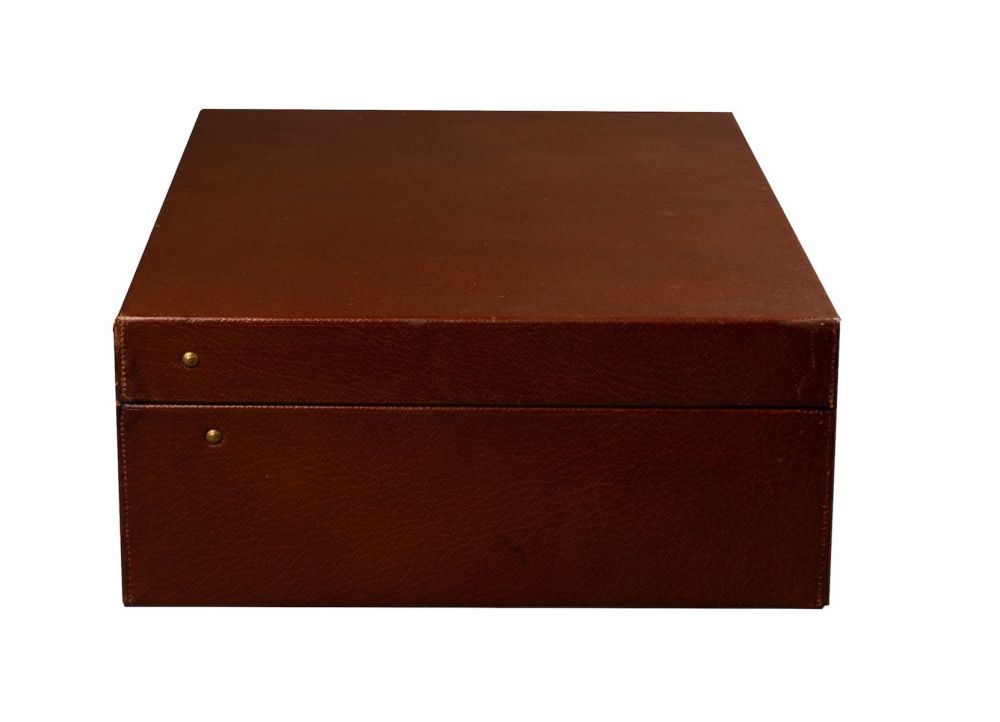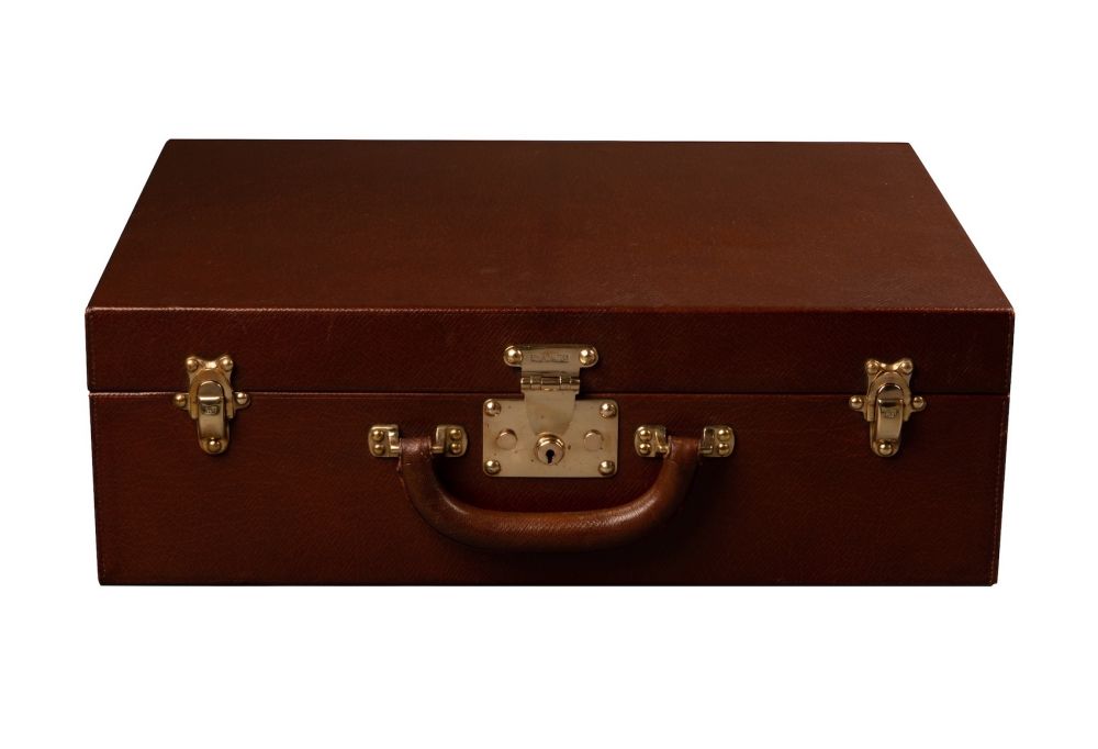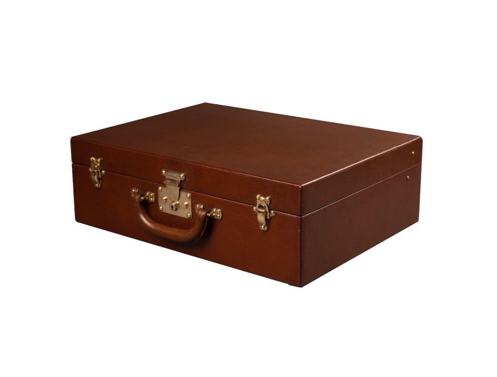 Exceptionnelle valise Louis Vuitton en cuir grainé marron Havane, aménagée d’un nécessaire de voyage pour un homme du début du XXème siècle. La valise est équipée de sa housse d’origine, avec des fermoirs estampillés « Louis Vuitton Paris ».