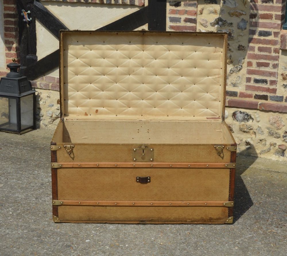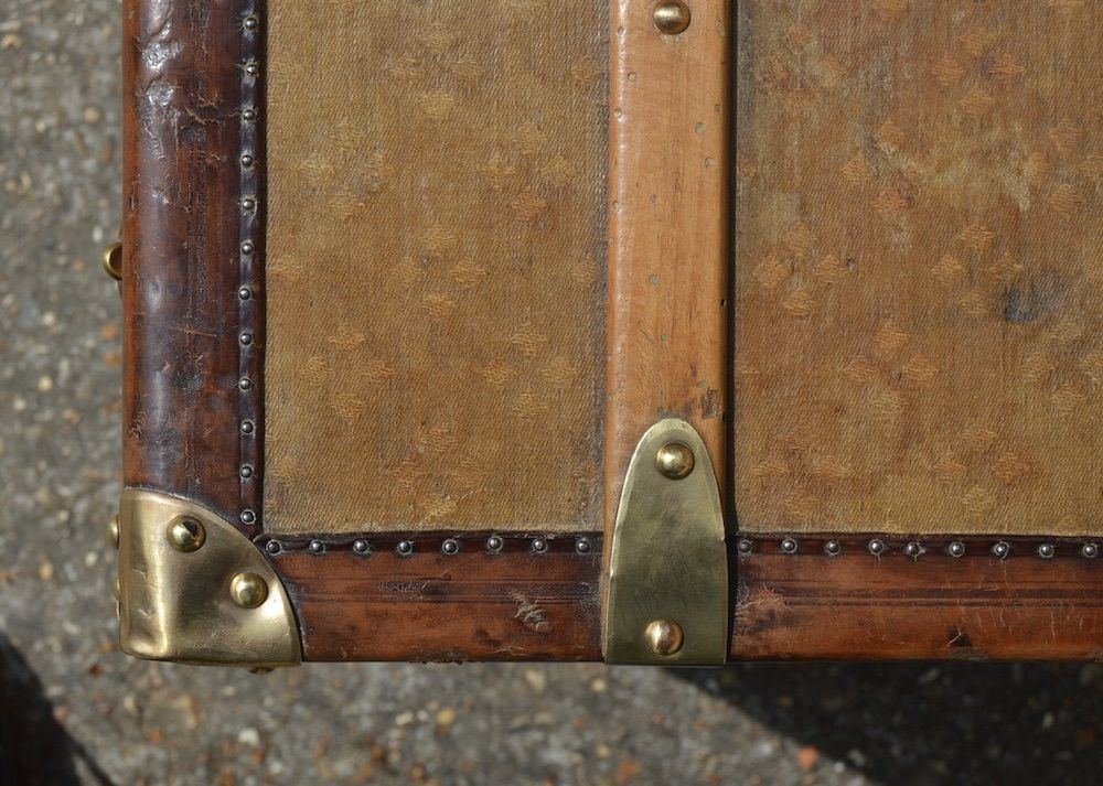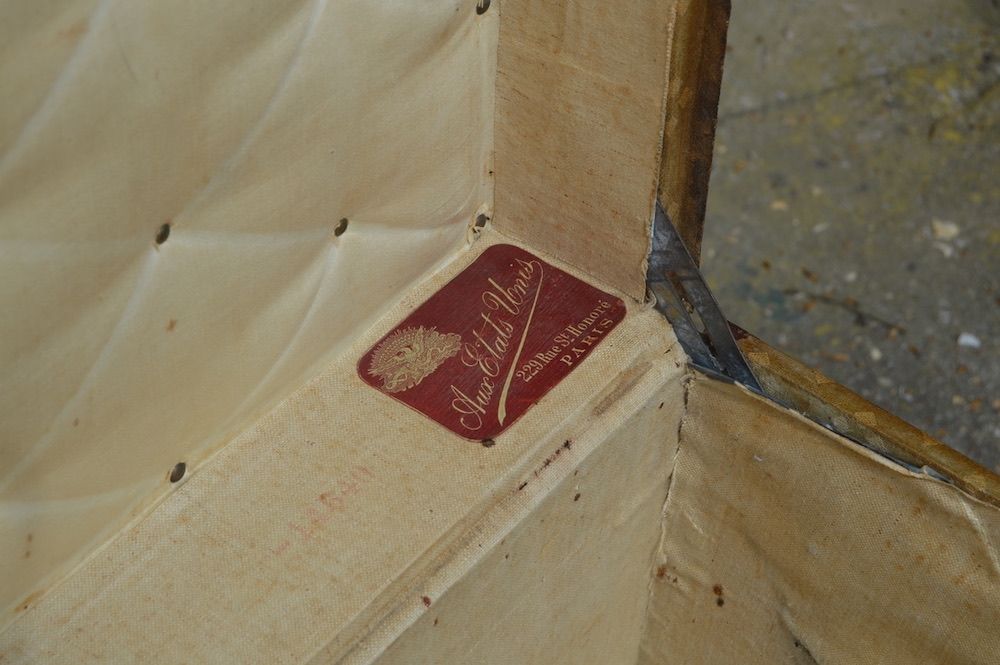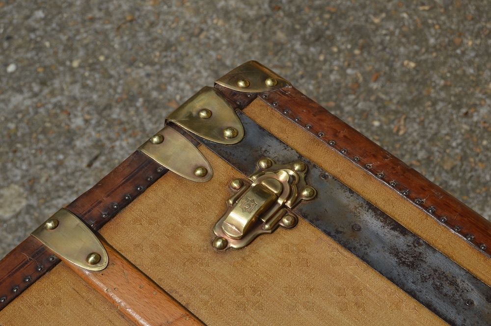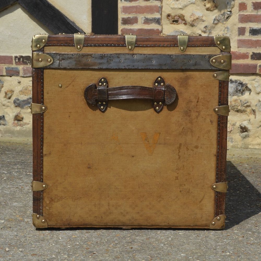 Bon état : La malle est en bon état pour son âge, avec une superbe patine de la toile extérieure. Le bandeau était originalement recouvert de cuir.
