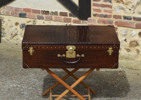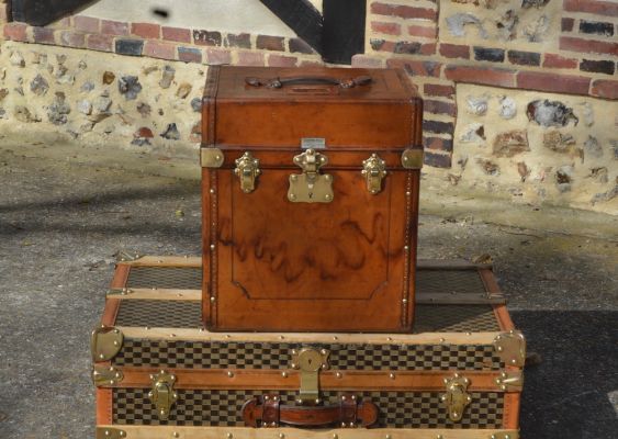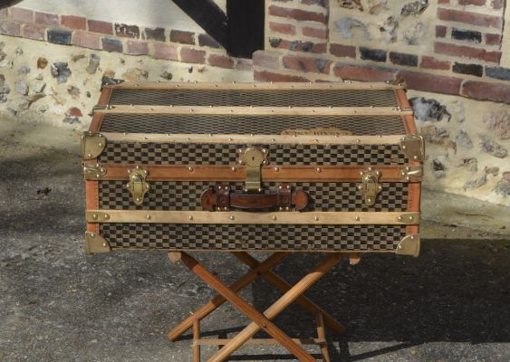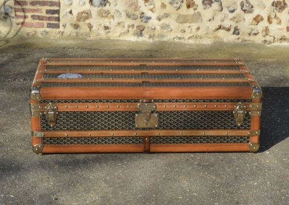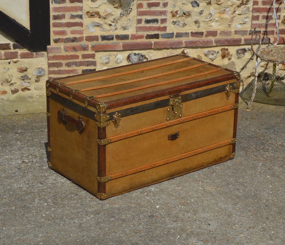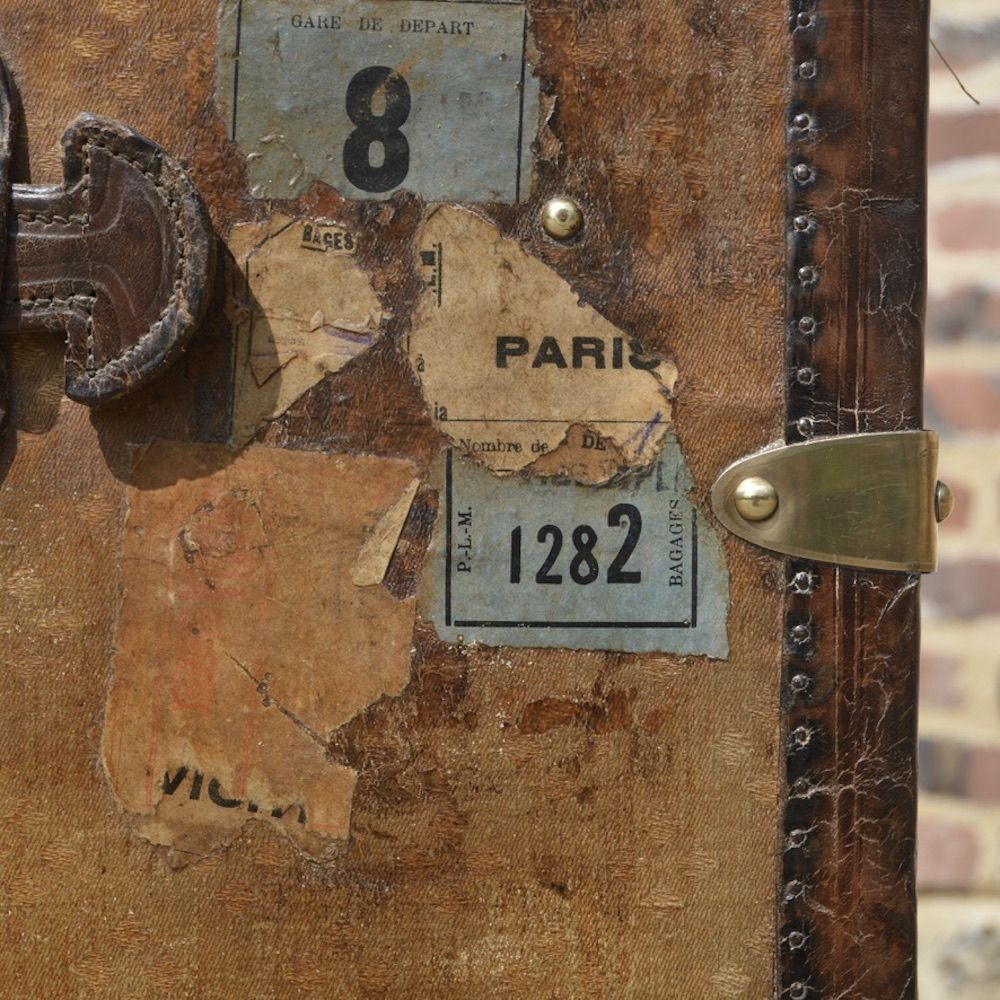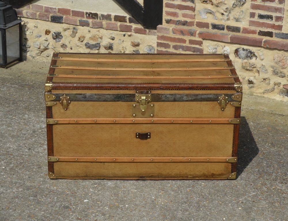 Bon état : La malle est en bon état pour son âge, avec une superbe patine de la toile extérieure. Le bandeau était originalement recouvert de cuir.