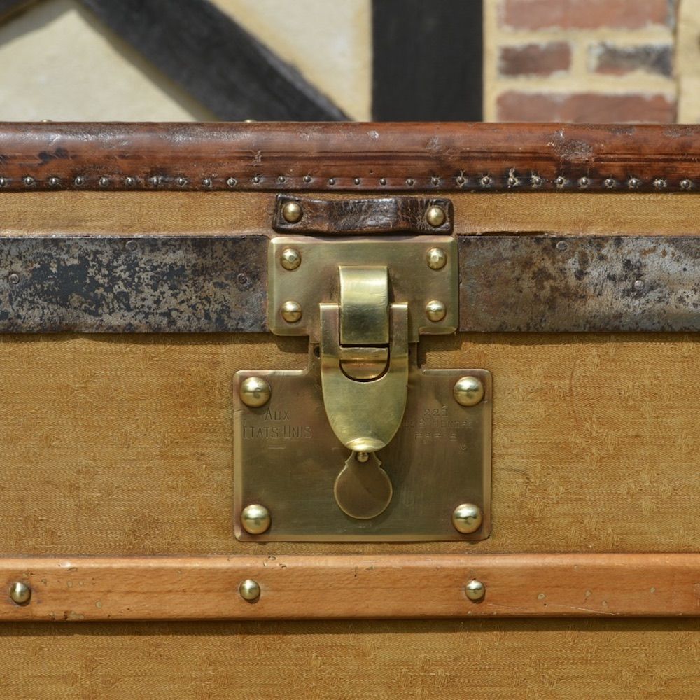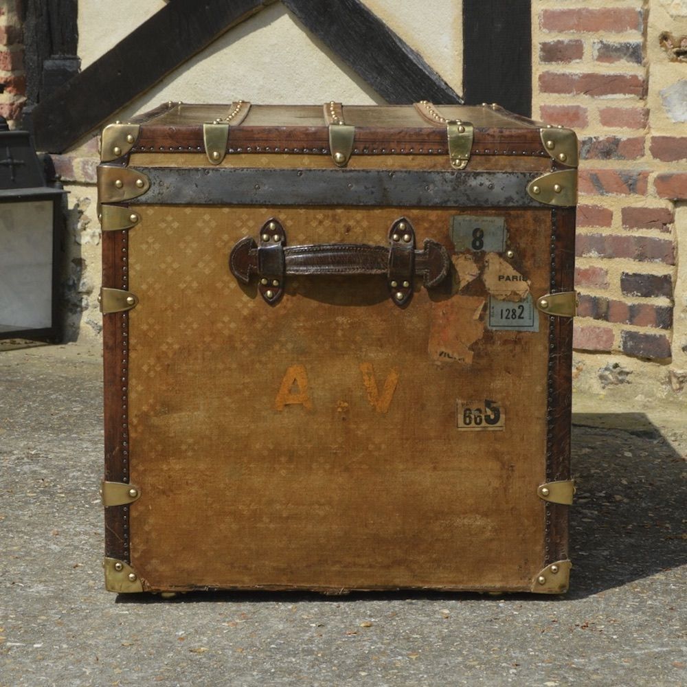 Très belle malle courrier de la marque française Aux Etats Unis des années 1900, recouverte de la toile monogramme jacquard du fabricant. La malle est protégée par des bordures en cuir, avec une bijouterie en laiton et deux poignées. On retrouve le nom et l'adresse du fabricant rue saint-honoré gravé à la main sur la serrure centrale. Les initiales A.V sont peintes sur chacun des cotés, avec de nombreuses étiquettes de transport de ses derniers voyages.