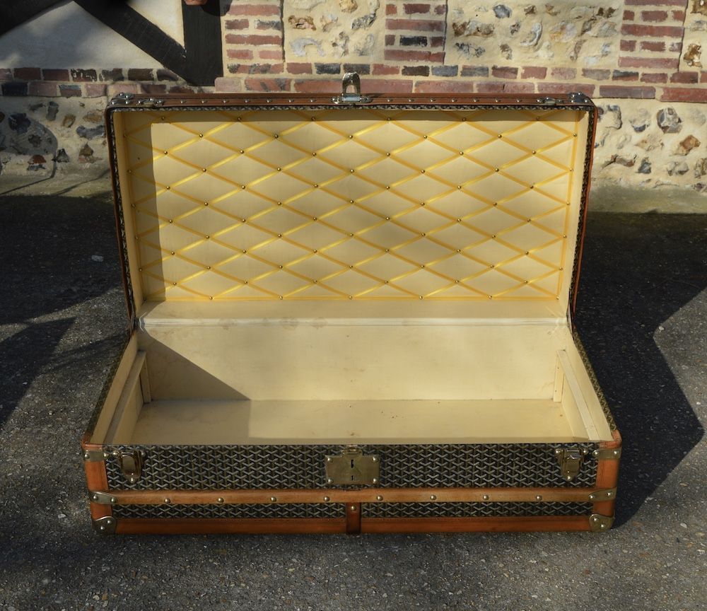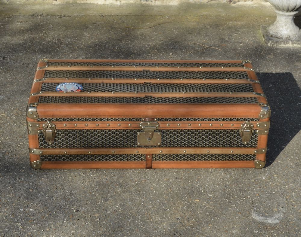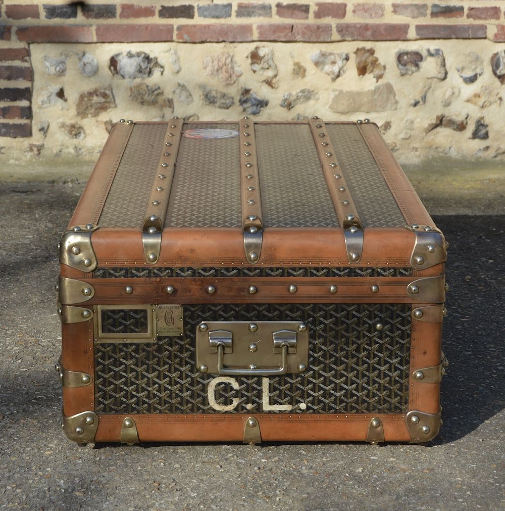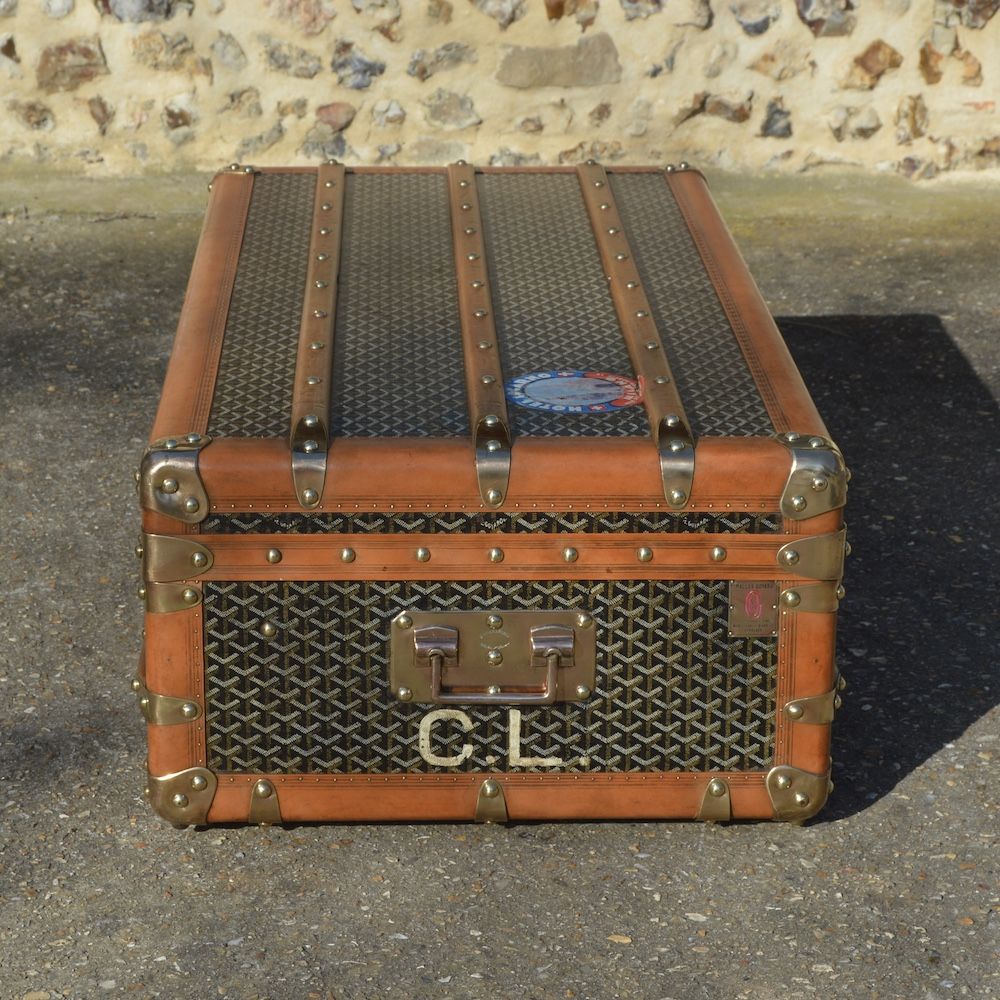 Exceptionnelle Malle cabine Goyard des années 1930, recouvertes de l'emblématique toile Goyardine monogramme et protégées par des bordures en lozine. On remarque que cette malle est conçue avec des bordures et des lattes largement plus épaisses. Ces renforts étaient appréciés des voyageurs à destination des états unis, car les voyages transatlantiques étaient réputés pour être particulièrement éprouvant pour les malles et bagages. Ces caractéristiques assuraient aux clients de retrouver leurs malles en bon état.