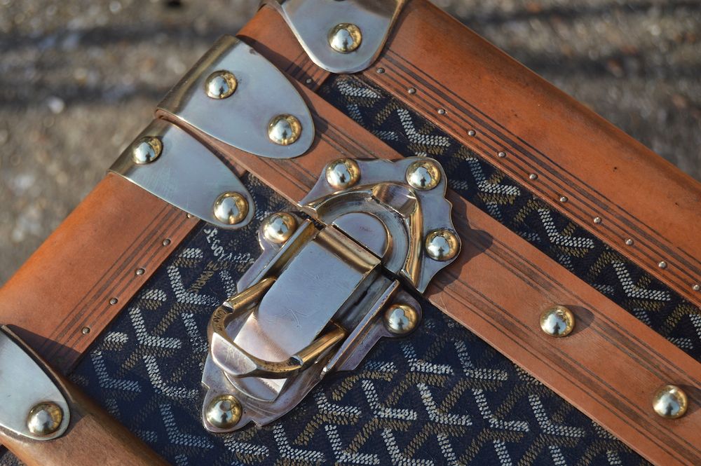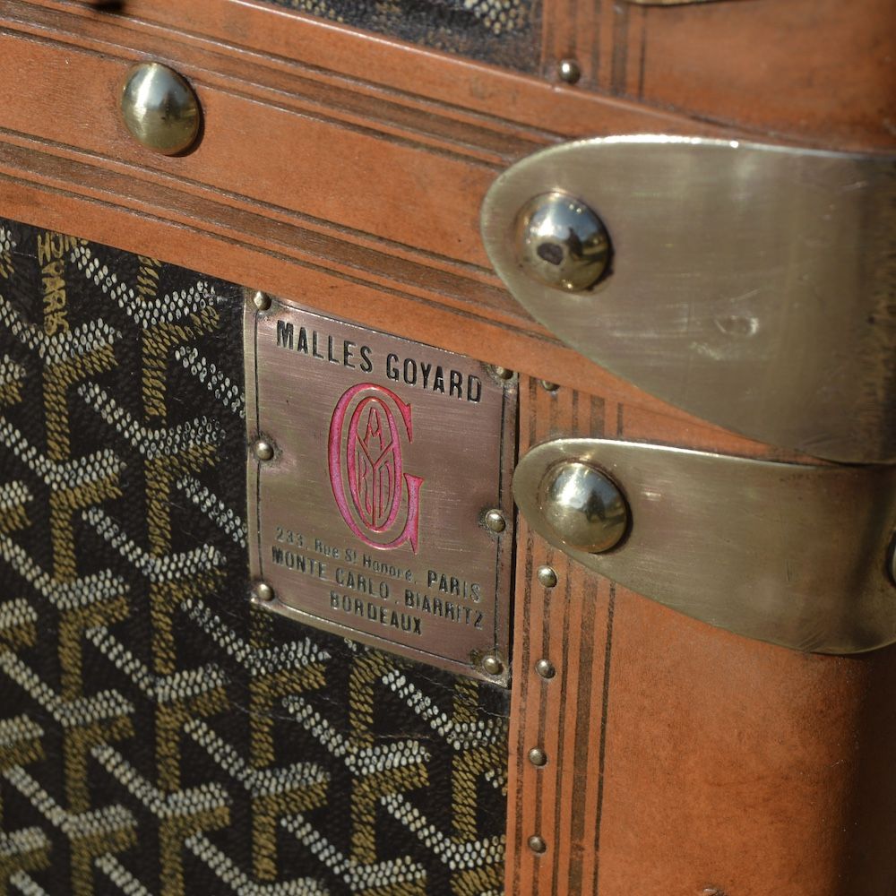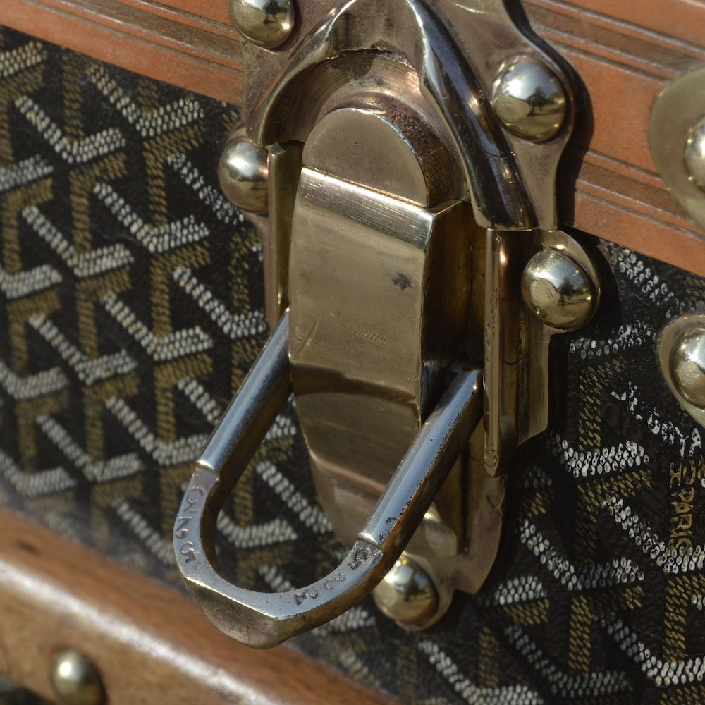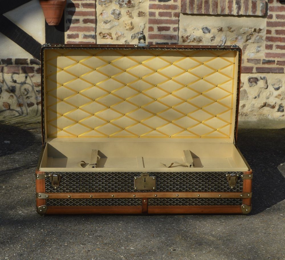 Exceptionnelle Malle cabine Goyard des années 1930, recouvertes de l'emblématique toile Goyardine monogramme et protégées par des bordures en lozine. On remarque que cette malle est conçue avec des bordures et des lattes largement plus épaisses. Ces renforts étaient appréciés des voyageurs à destination des états unis, car les voyages transatlantiques étaient réputés pour être particulièrement éprouvant pour les malles et bagages. Ces caractéristiques assuraient aux clients de retrouver leurs malles en bon état.