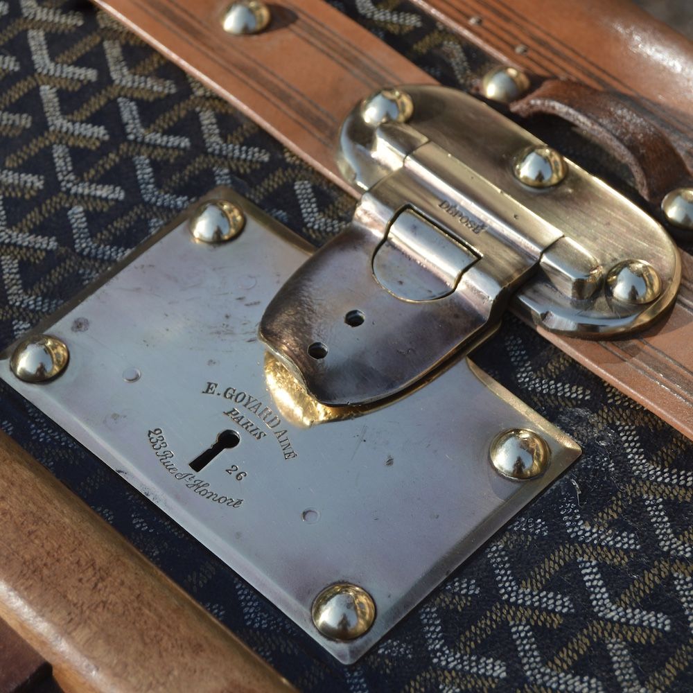 La malle est équipée de fermoirs et bijouterie en laiton estampillé E. GOYARD Ainé PARIS. On retrouve sur les deux crapauds un numéro de fabrication 523 ainsi que l’adresse du 233 rue St honoré sur la serrure centrale.