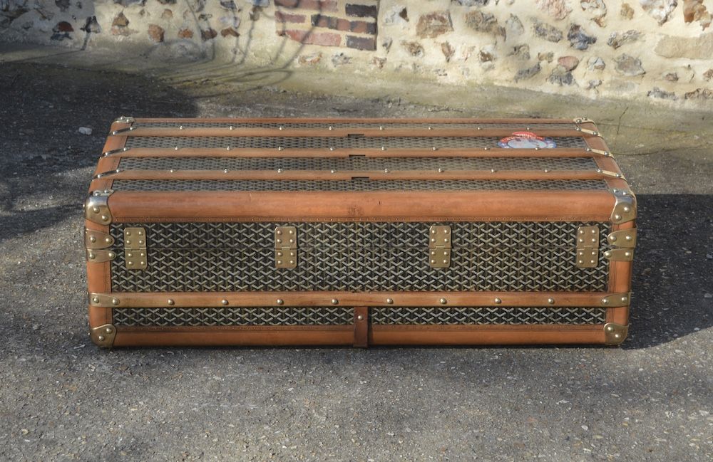 Ces malles ont disparu des catalogues de vente des maisons Louis Vuitton ou Goyard lorsque l'avion a supplanté les lignes de paquebots dans l'immédiate après-guerre. A défaut de voyager aujourd'hui avec ces malles cabine, leur format est idéal pour faire une table basse. Souvent protégée d'un verre, c'est l'assurance d'avoir une table peu commune, chargée d'histoire et symbole d'un art de vivre au début du XXeme siècle.