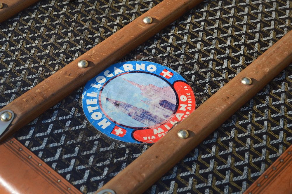Le passage d’une sangle en cuir de renfort est prévu sous les lattes épaisses. On remarque une étiquette de l’hôtel LOCARNO à Milan, indiquant un voyage de la malle en Italie. Le fond du bagage est recouvert de zinc, pour protéger le contenu de la malle de l’humidité.